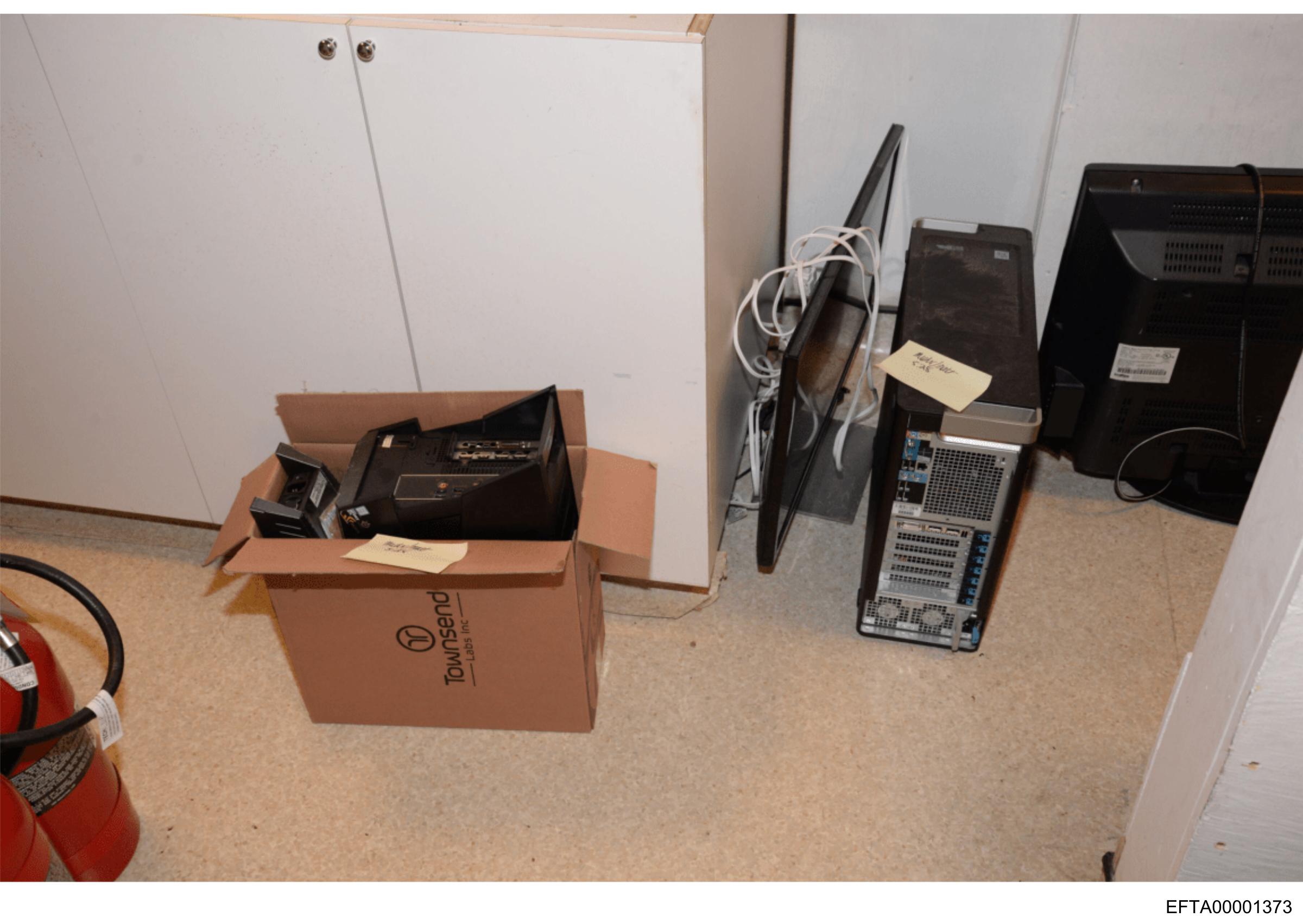 The image depicts an indoor setting where a collection of electronic equipment is placed on the floor. Specifically, there are multiple computer CPU towers and one flat screen monitor. The monitors are open with their backsides facing up, showing various components like fans and heat sinks. There's also a cardboard box with items inside it, indicating that it might be in the process of being packed or unpacked. In the background, partial views of cabinets can be seen, suggesting this scene takes place within an office or storage space.