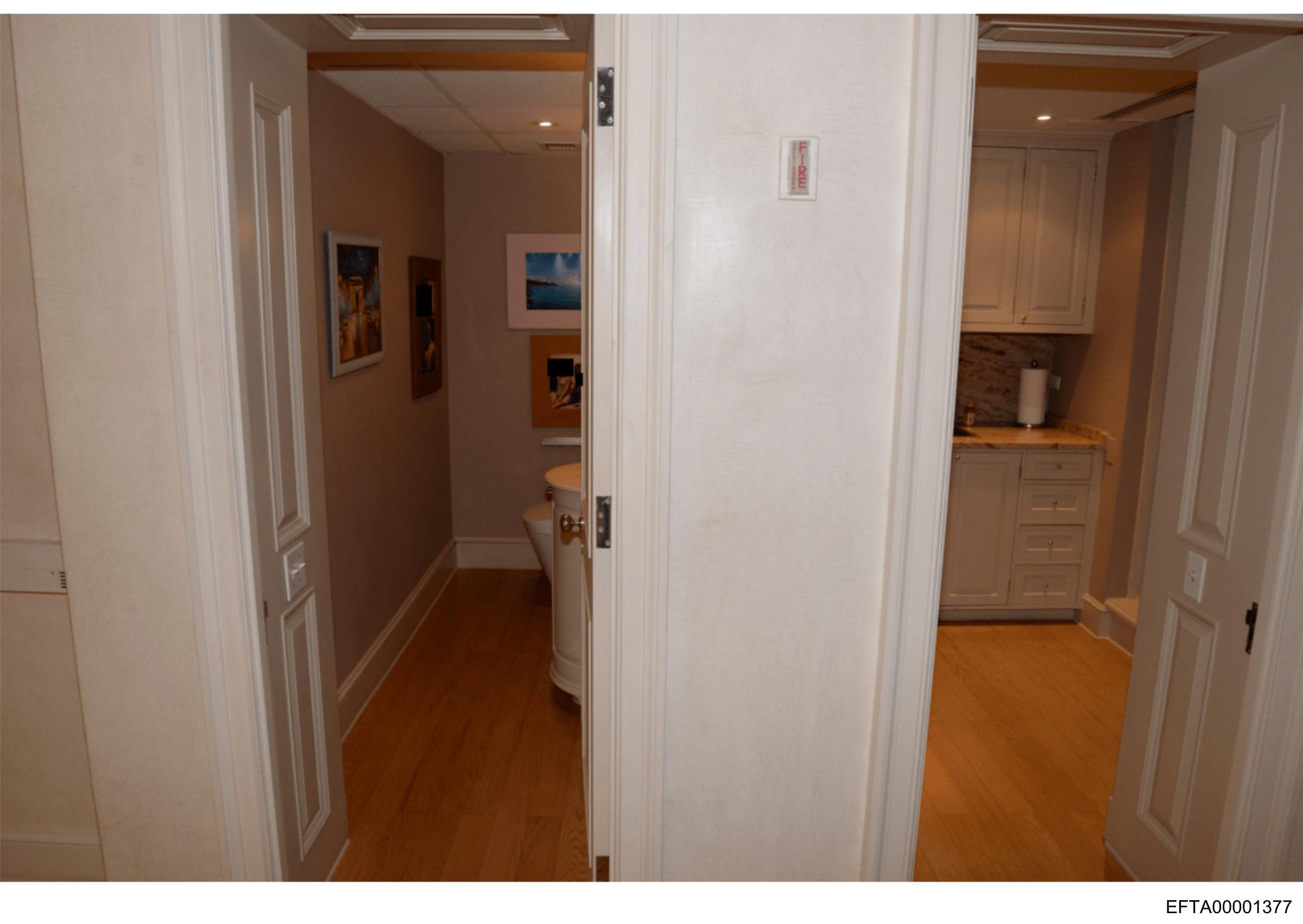 The image is a blurry photograph of an interior space that appears to be a hallway leading from a room with dark walls and a single picture hanging on the wall to another room that seems brighter and has wooden flooring.