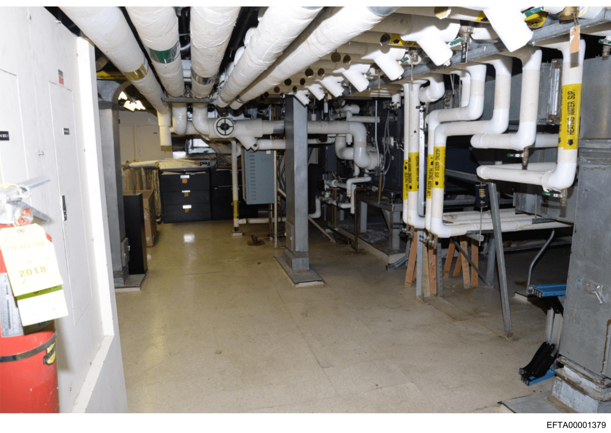 This is an interior photo of a room with industrial machinery. There are multiple pipes and ductwork on the ceiling. The flooring appears to be made of concrete. On the right side, there's a piece of equipment with yellow stripes, which could indicate caution or safety-related information. There are no visible texts, people, or distinctive locations that can be confidently identified from this image alone.