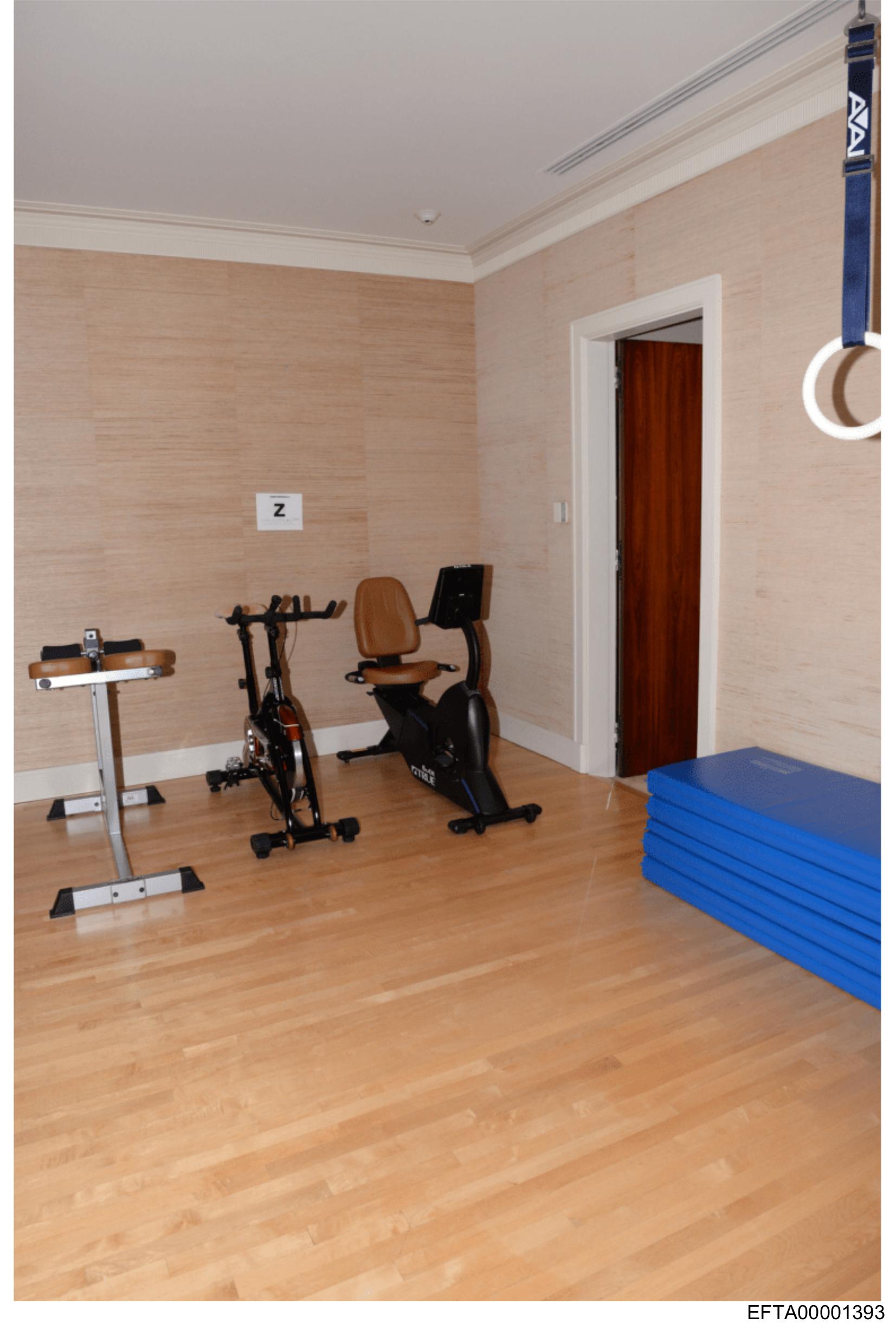 The image depicts an indoor gym equipped with various exercise machines and mats on a wooden floor.