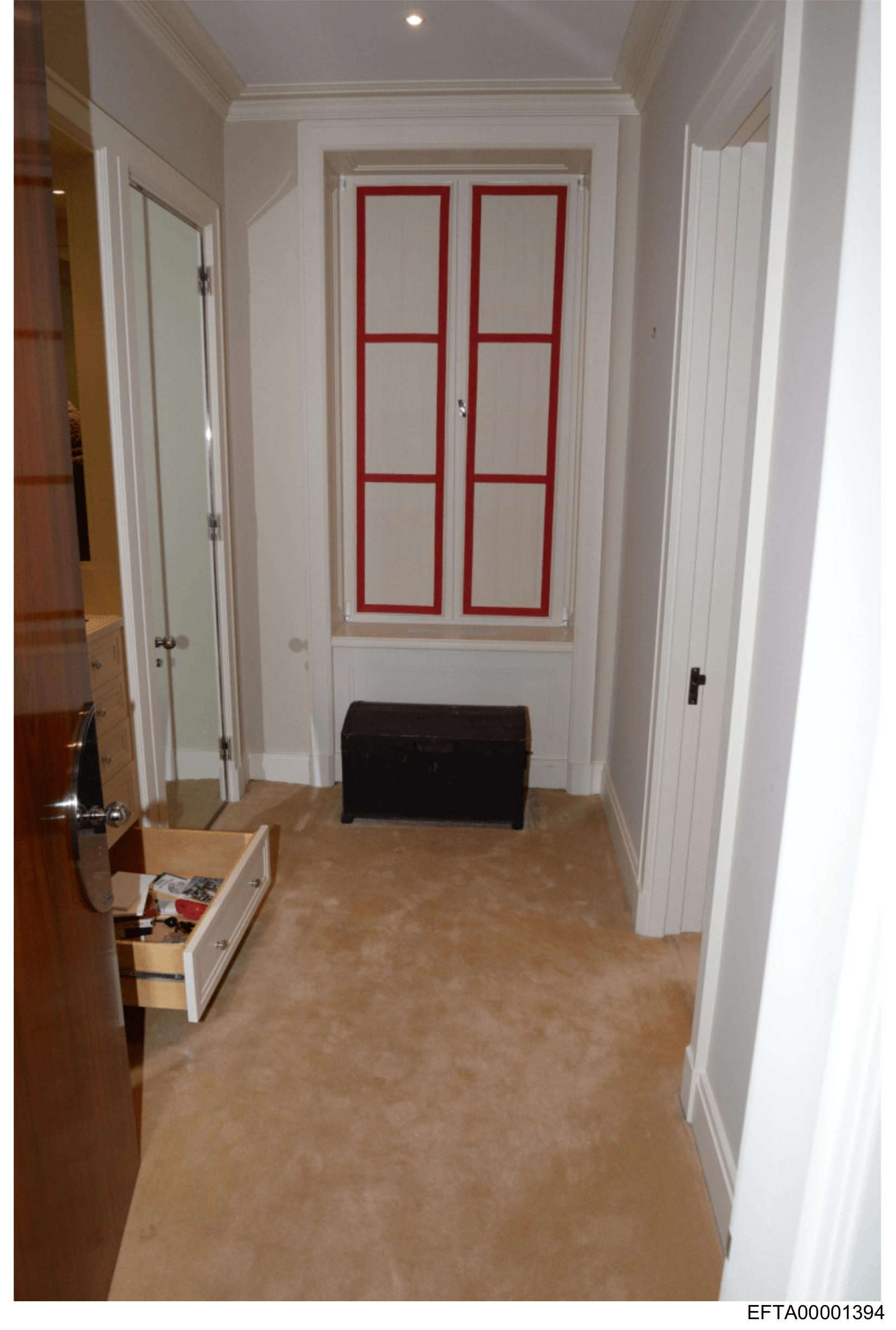 The image shows a hallway with wooden flooring and walls painted in white.