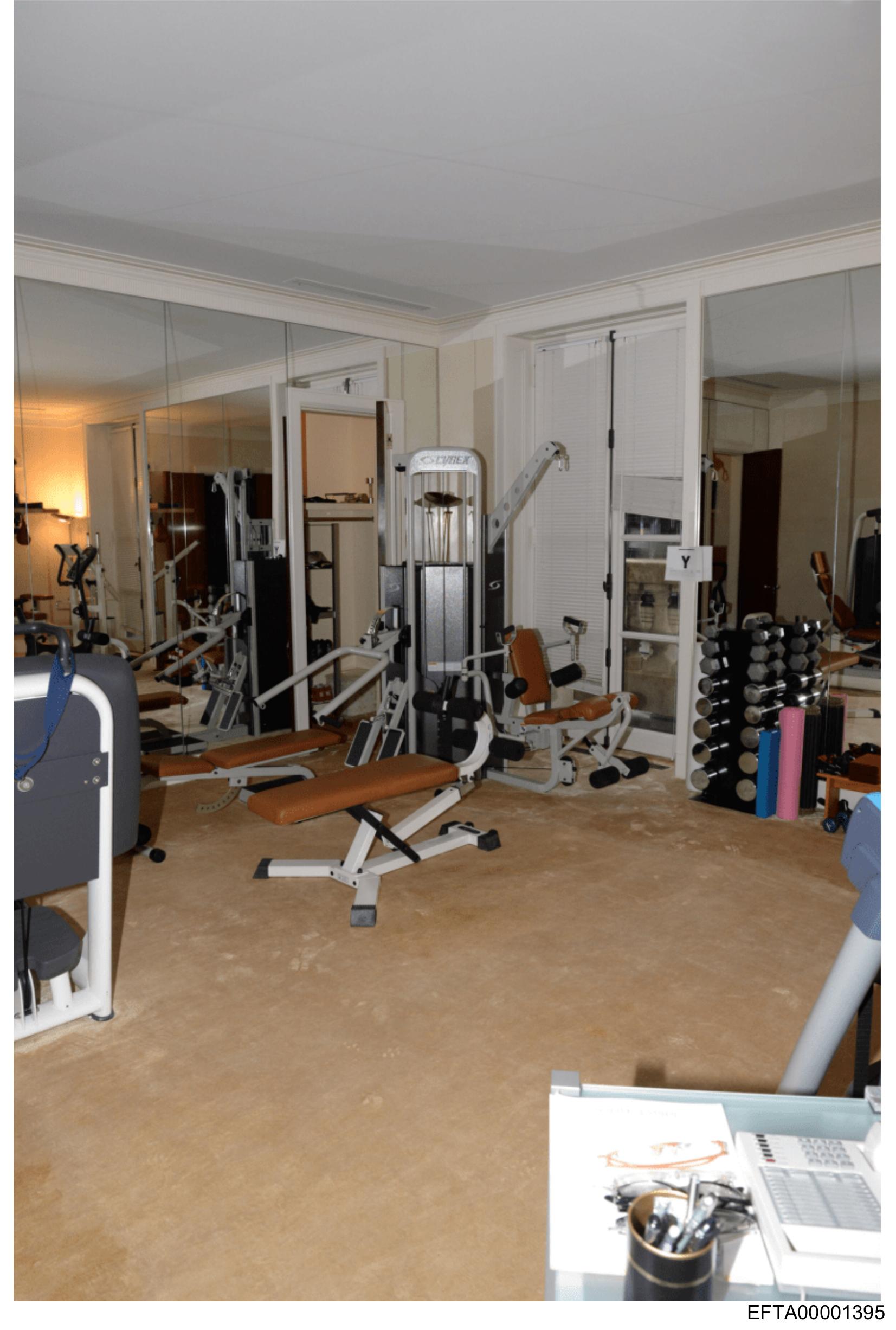 This is an image of a gym interior showing various pieces of exercise equipment and weights.