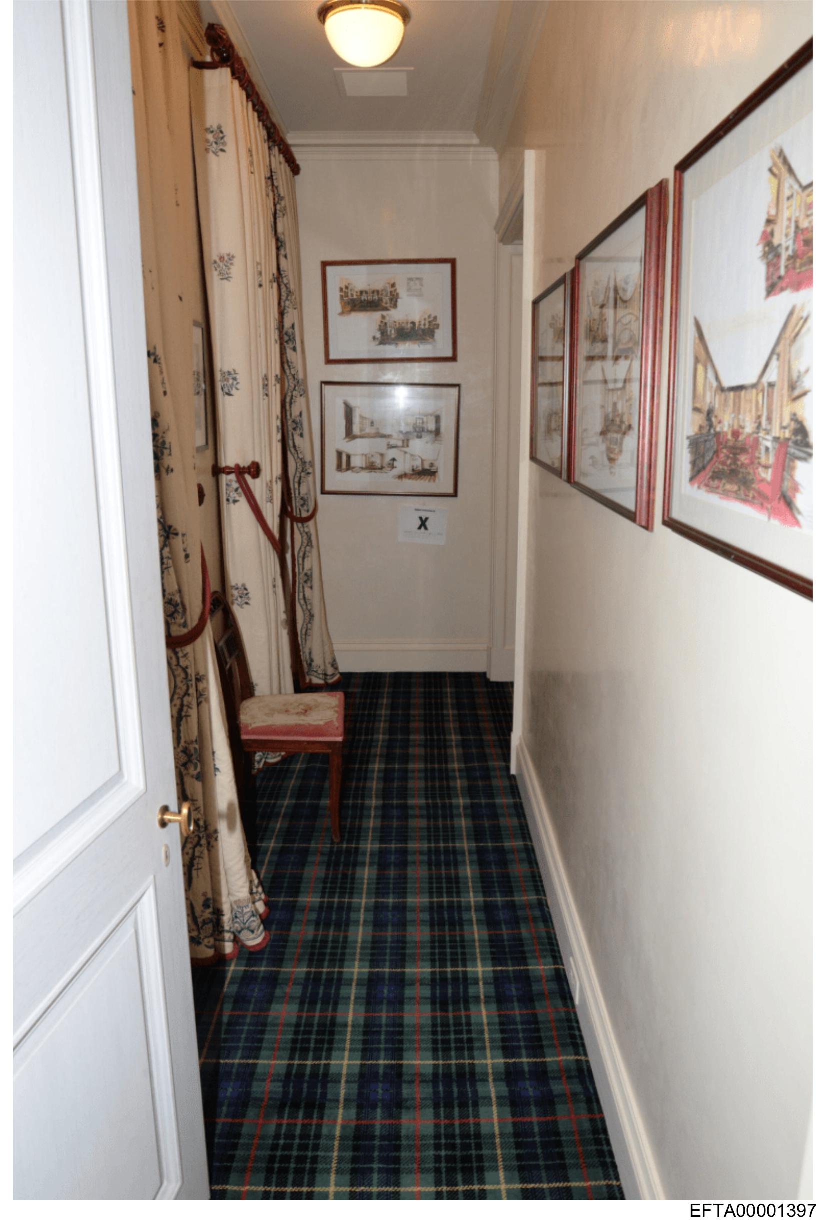The image shows an interior view of a hallway leading into another room. The hallway is narrow with walls covered in what appears to be wallpaper and adorned with framed pictures or prints along the upper wall area. On the left side of the frame, there is a patterned shower curtain partially visible, suggesting that this hallway may lead to a bathroom. The floor is carpeted with a plaid pattern, predominantly in shades of blue and brown, which adds a touch of color and pattern to the otherwise neutral-toned space. The door at the end of the hallway is closed, but it seems to be made of wood or a similar material, contributing to the room's cozy atmosphere. There is no visible text or any people in this image.