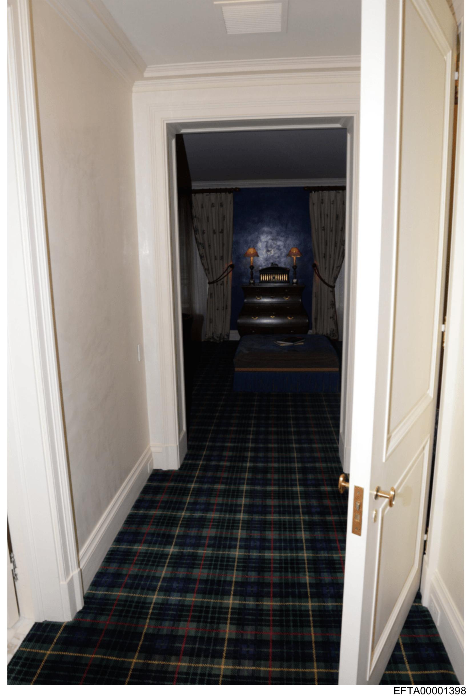 The image depicts an indoor corridor with a dark blue carpet featuring a pattern that could be described as plaid.
