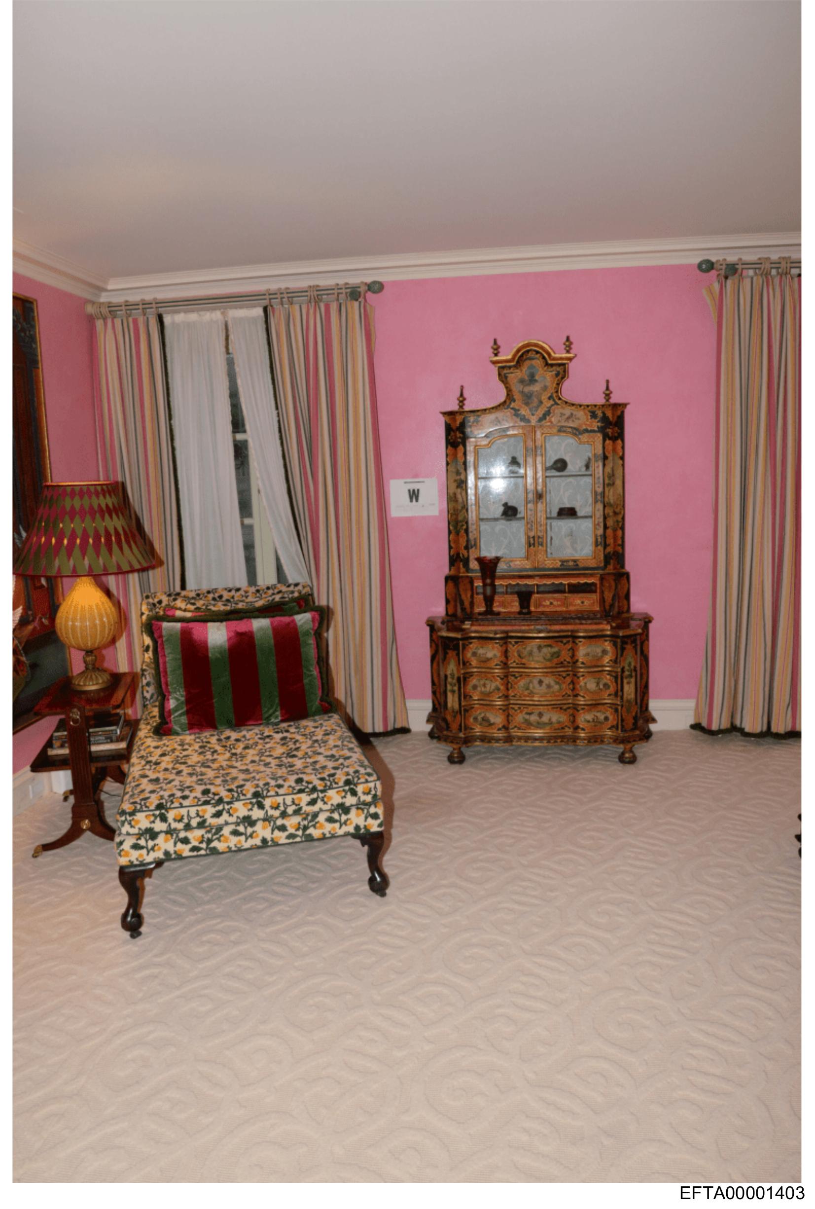 The image shows an interior room with a distinctive pinkish hue to the walls. There's a large piece of furniture resembling a bureau against one wall, featuring intricate designs and possibly a mirror on top. To the left, there is a chair with a patterned upholstery. On the right side, a floor lamp stands, and further in the background, another chair can be seen. The flooring appears to be carpeted. There are no visible texts or people in the image. The style of the room suggests a formal or classical design aesthetic.