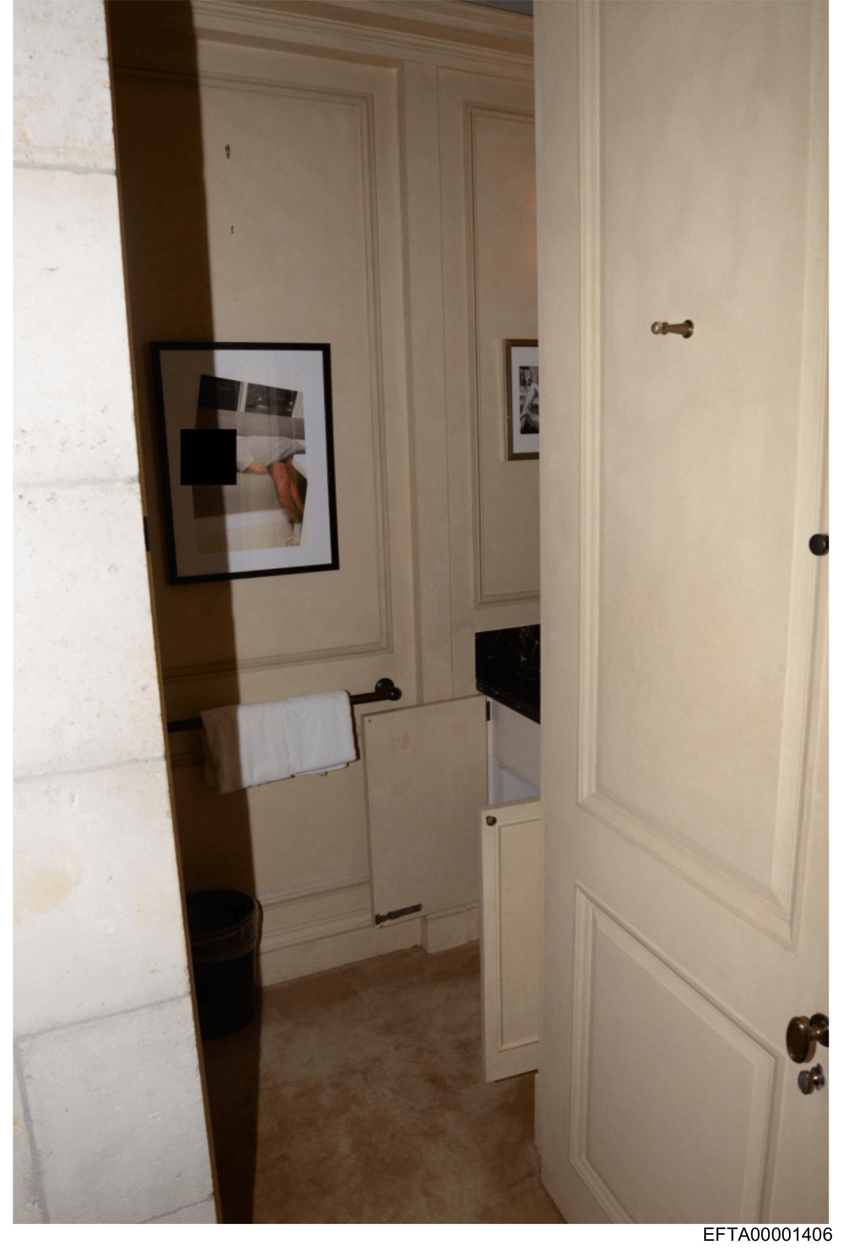 The image shows a dimly lit hallway with light brown walls and wooden panels on the upper half. To the left, there's a framed picture hanging above a small trash can. The door at the end of the hall is open, revealing another room inside which has some items that are not clearly distinguishable due to the glare and angle. There is no visible text or people in the scene. The style of the image suggests it may have been taken with a camera flash, which results in light reflections on surfaces like the door frame.