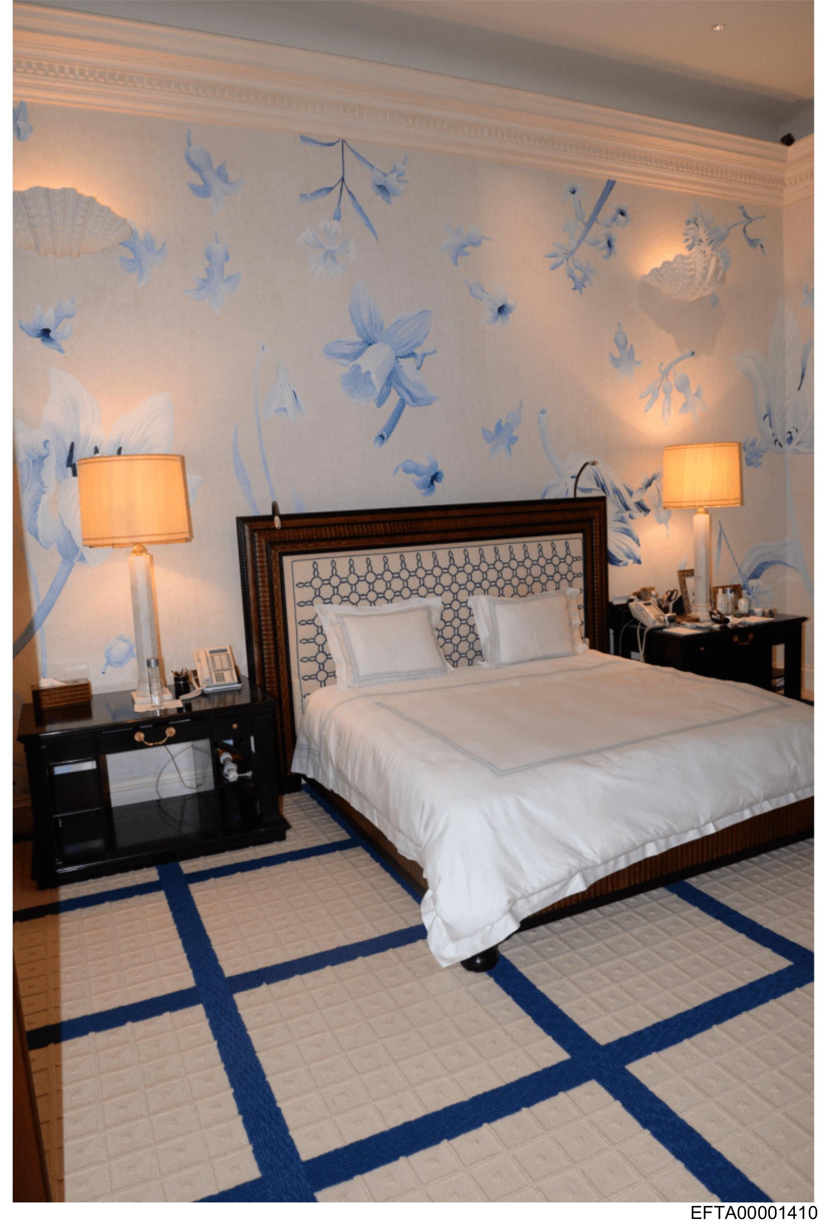 The image shows a luxurious bedroom interior with a focus on a large bed in the center. The bed is adorned with multiple pillows and has a high headboard. Flanking the bed are two nightstands each with a lamp that casts a warm glow. Above the bed, there's an ornate wall decoration featuring blue floral designs. A dark wooden frame surrounds the bed, providing contrast to the white bedding. The room has a carpet with a geometric pattern in shades of blue and beige, complementing the color scheme on the walls. There is no visible text or people in the image. The style of the photograph suggests it could be used for promotional purposes, showcasing the interior design and comfort of the space.