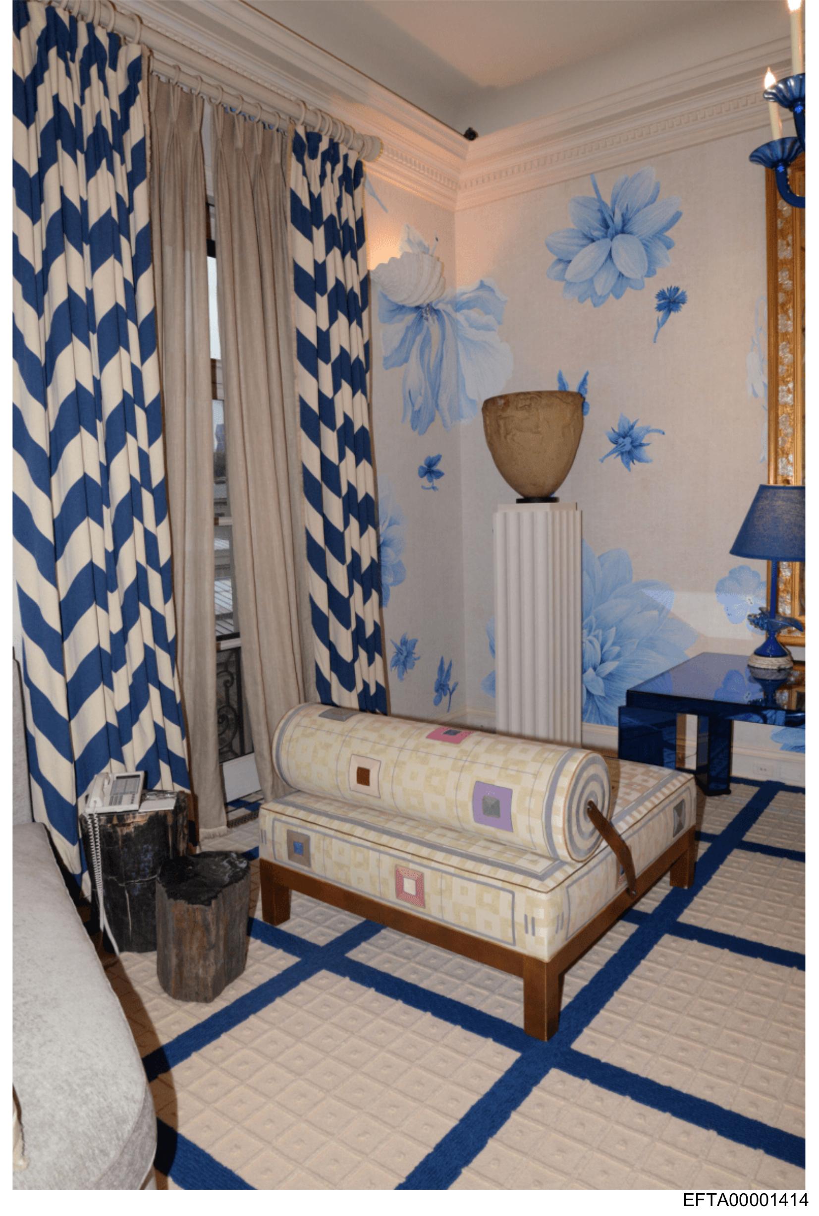 The image depicts an interior room decorated with a distinct color scheme and patterns. There is a large blue and white chevron patterned curtain on the left side of the frame, partially drawn back to reveal a window behind it. The walls are adorned with blue floral wallpaper that repeats across the visible expanse. A wooden console table with a curved top can be seen in the middle distance, upon which rests a tall vase and two lamps with shades. A sofa is present on the right side of the image, featuring a patterned upholstery with what appears to be paisley or floral designs in light and dark tones that complement the overall color palette. The carpet beneath has an abstract geometric design in blue, beige, and black hues. There are no visible texts, people, or specific locations identifiable from this image alone.