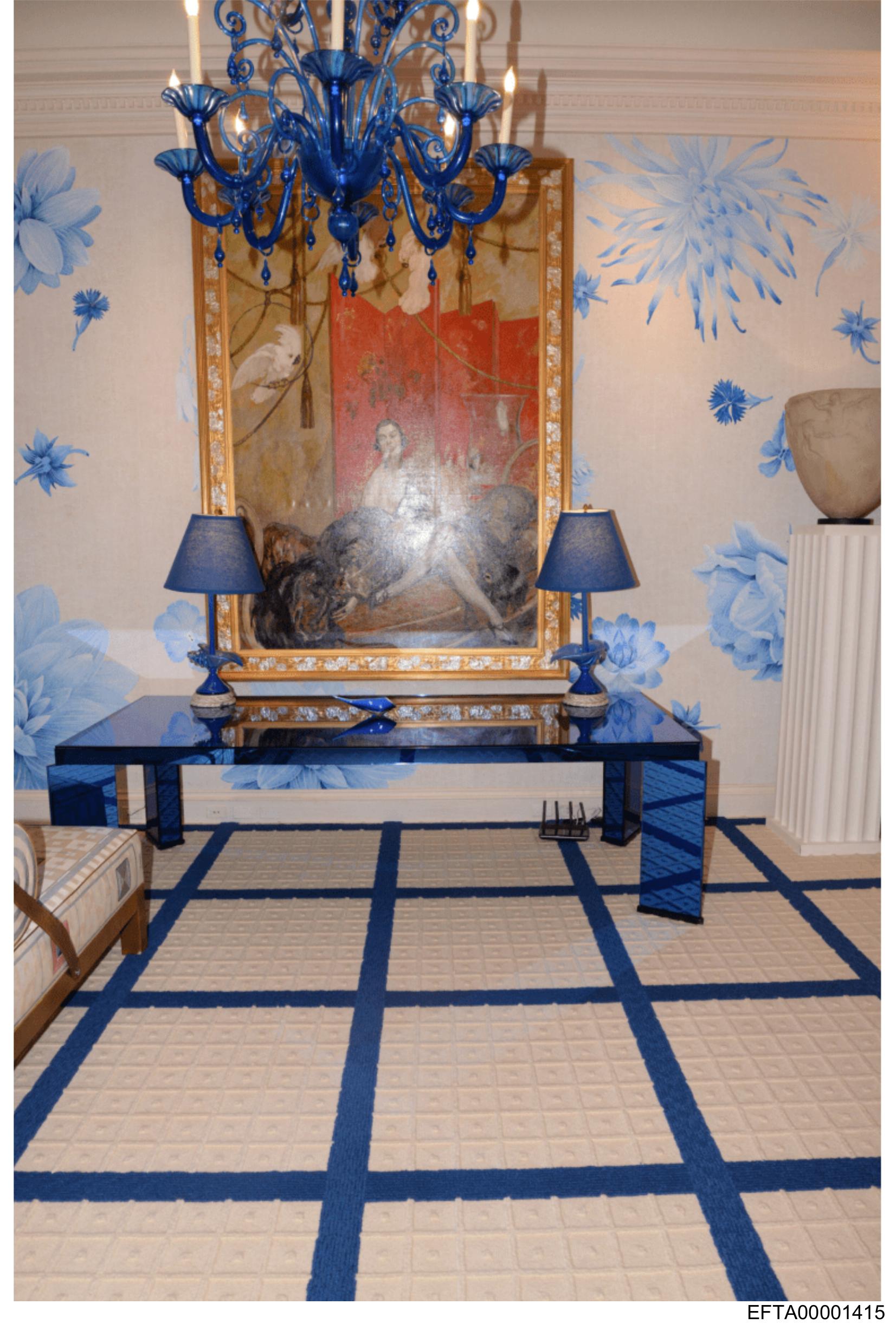 The image shows an interior space with a room that is decorated in shades of blue and white. The flooring features a geometric pattern, predominantly in blue and white colors that echo the theme of the room. In the center of the room, there is a couch with a matching blue cushion and armrests, also adorned with white accents. Above the couch hangs an ornate chandelier with intricate designs. On the wall behind the couch, there's a framed artwork depicting a floral arrangement. To the right, there's a round vase with a plant that matches the room's color scheme. In the bottom right corner of the image, there is visible text "ET 500" which could be part of a watermark or some form of branding.