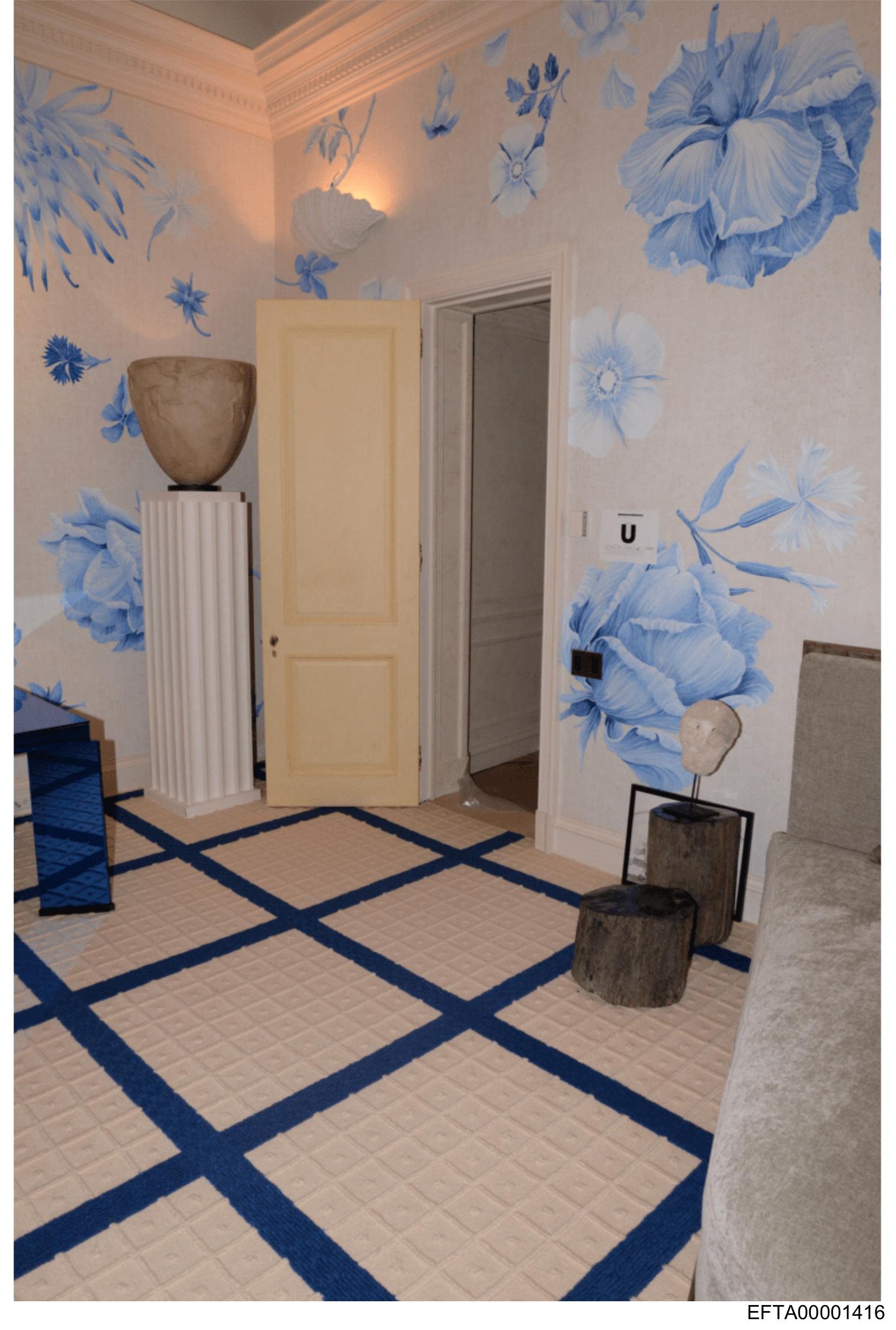 The image shows an interior room with a distinctive wallpapering that features blue floral patterns.