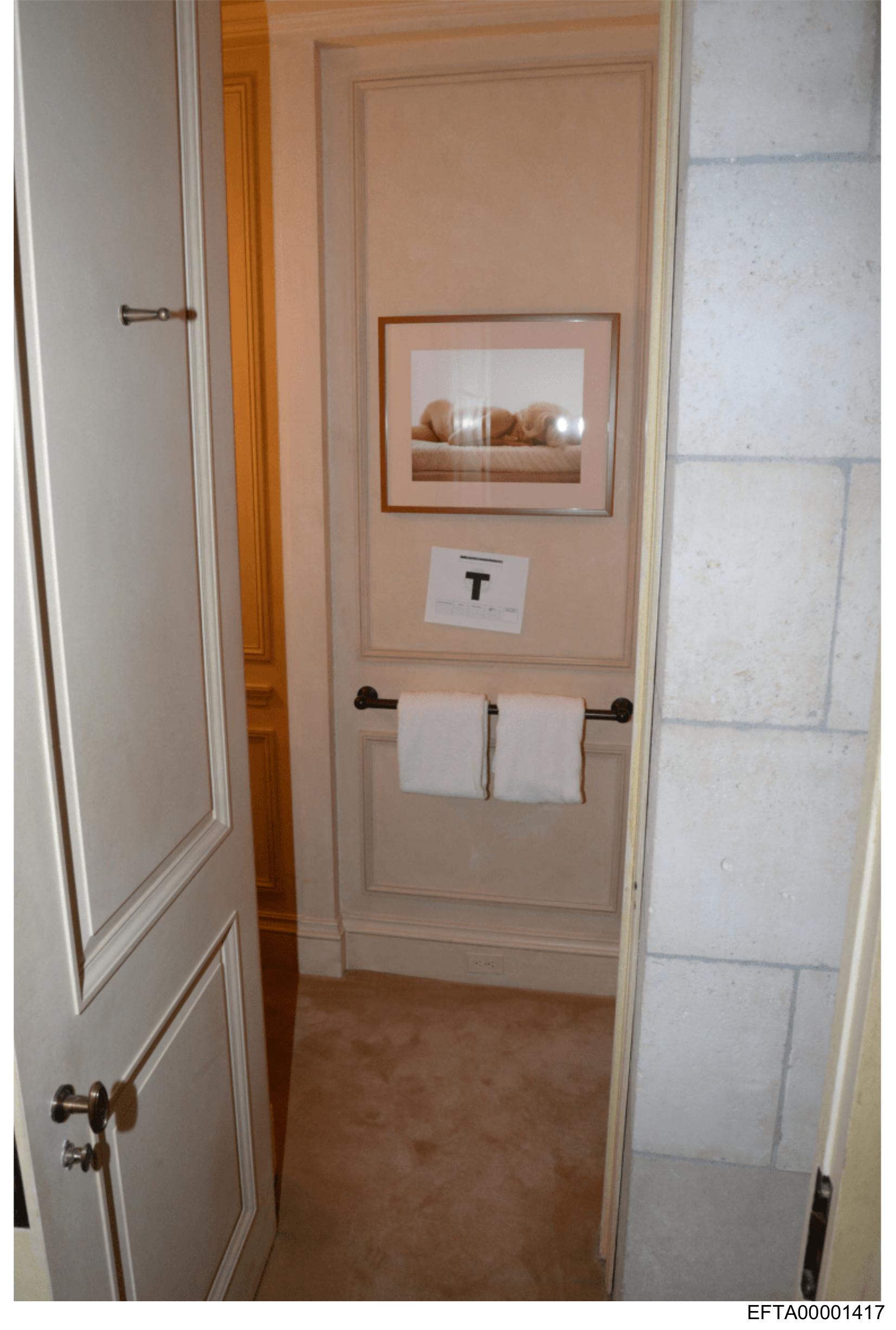 The image depicts a narrow hallway with an open door on the left side leading to another room. In the foreground, there is a neatly folded towel displayed against the wall, which has the word "TOWEL" written in capital letters across it, suggesting that this might be a hotel or motel setting and the towel is for guests' use. To the right of the door frame, there is a piece of artwork hanging on the wall, partially visible with what appears to be an image of a landscape or seascape within its borders. The walls are painted in a light color, and the floor has carpeting that matches the tone of the hallway.