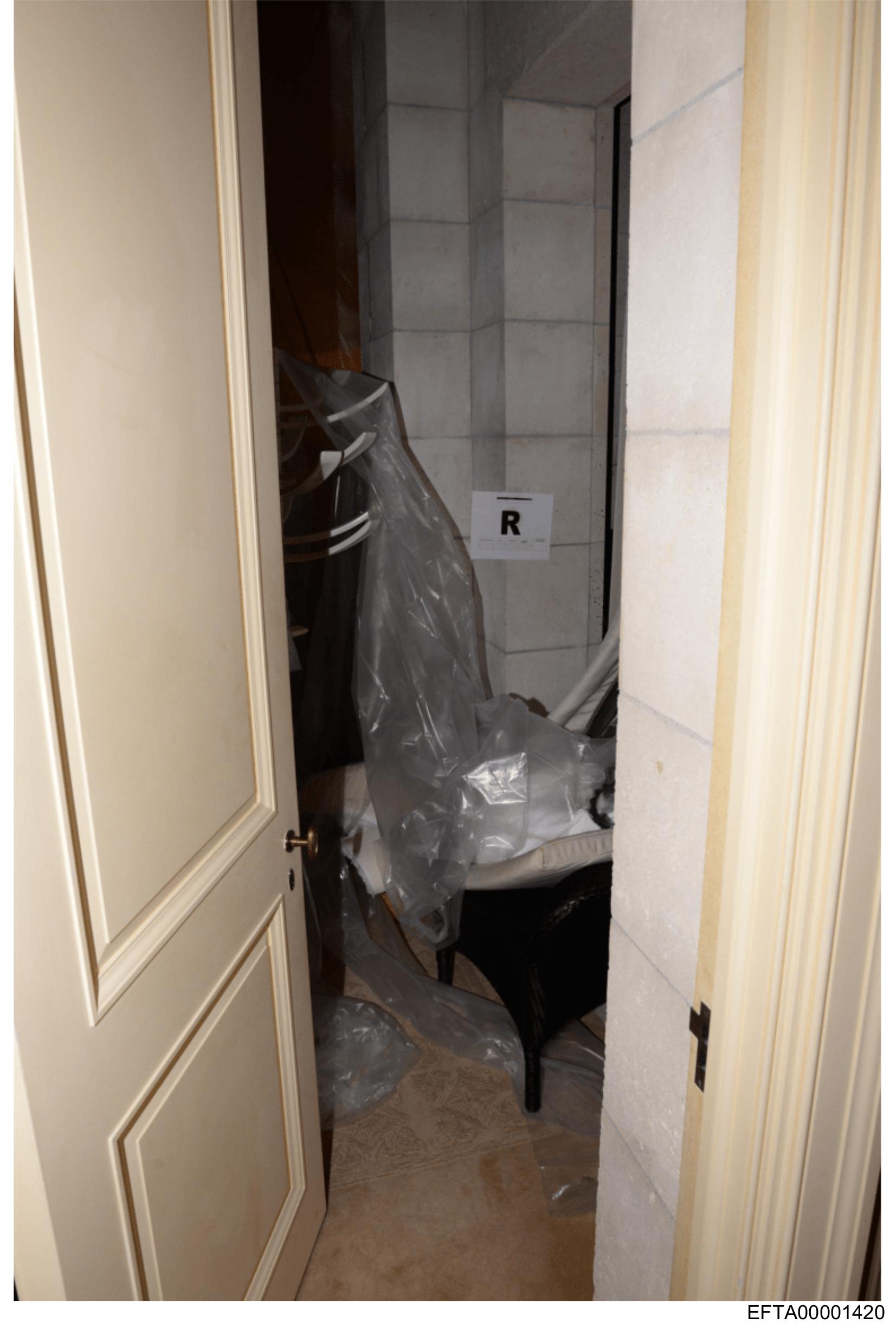 This is a photograph showing an interior space that appears to be under renovation or repair. In the foreground, there's a section of door frame with parts of what might have been a cabinet or wall unit wrapped in clear plastic and taped off. A piece of paper with the letter "R" on it is visible among the taped-off areas, though its significance is unclear from this image alone. The background features an interior wall with exposed wall studs and insulation, indicating that work has either just begun or is ongoing to address some structural issue or for renovation purposes. There are no people visible in the frame, and the focus of the image seems to be on the construction or repair process rather than a specific location.