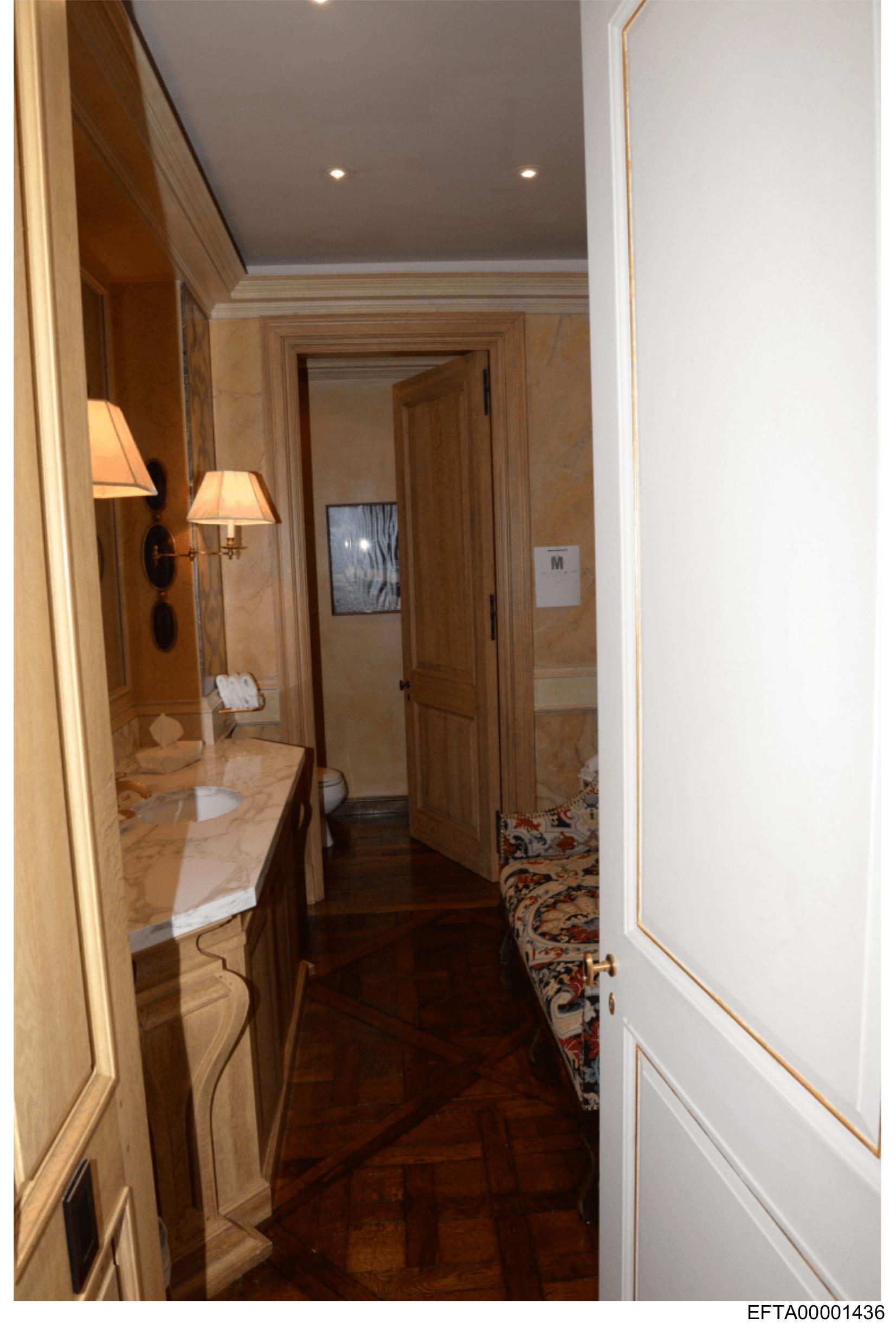 The image shows an interior hallway with walls adorned with decorative panels and trimmings that suggest a luxurious or formal setting, possibly within a hotel. The floor is covered with patterned carpeting, and there's a wooden door on the left wall with another door slightly further down the corridor. On the right side of the image, part of a bench or seating area can be seen. There is text in the lower-left corner that reads "