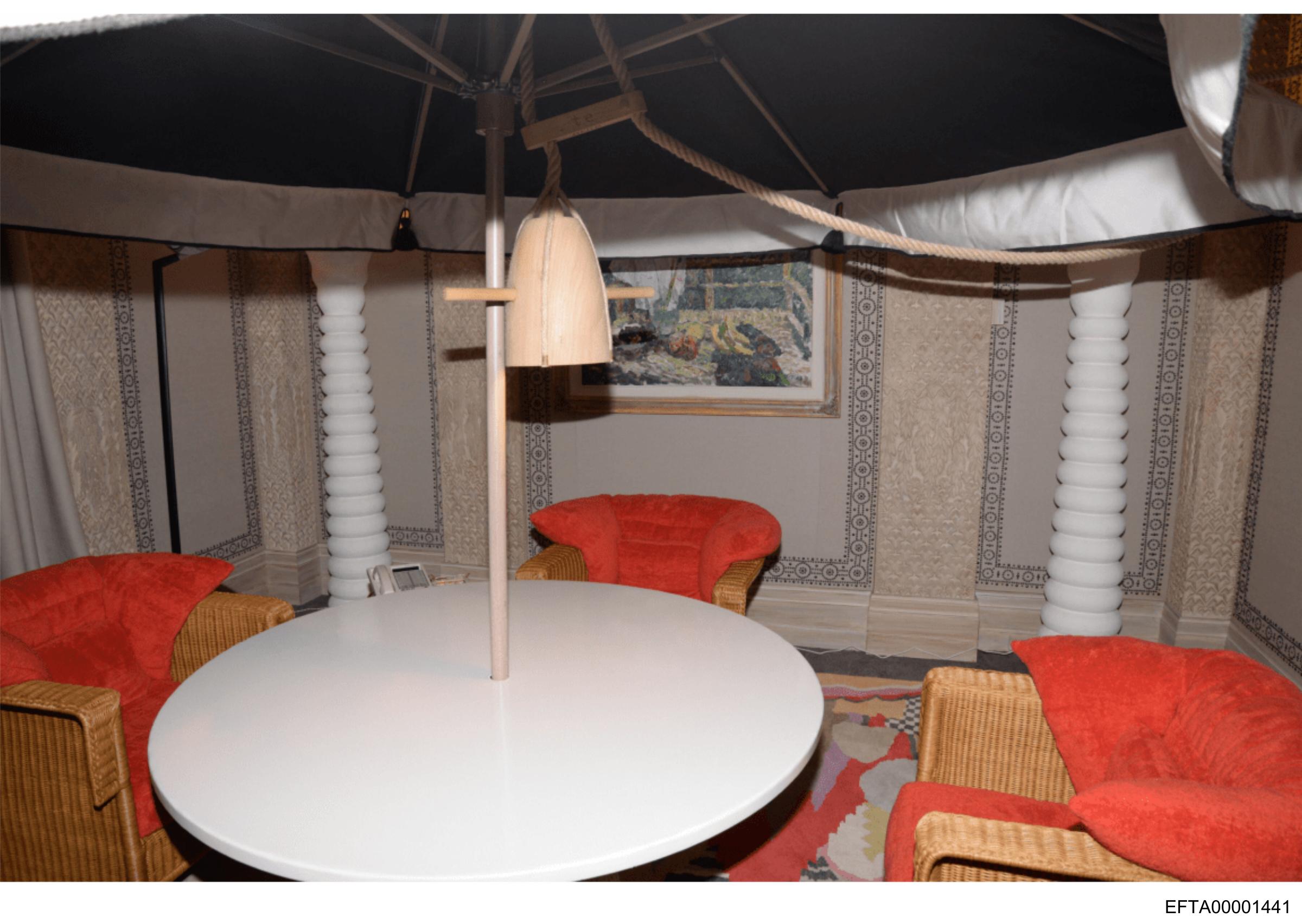 The image shows an interior space with a distinctive setting that appears to be a bar area. The room has decorative elements such as red velvet chairs, and the furniture is arranged around a central white table that seems to have some items on it, possibly for serving drinks or food. Above the table hangs a unique lamp fixture, which contributes to the ambiance of the space. The walls are adorned with textured wallpaper, and there's a hint of outdoor elements suggesting an open-air setting due to what appears to be the edge of a tent roof structure in the background. The overall style of the image is photographic, capturing the scene in natural colors and lighting.