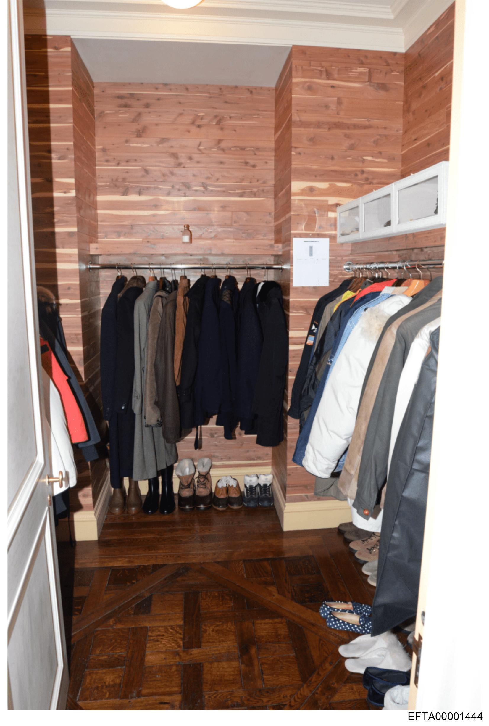 The image shows an interior space with a wooden wall featuring vertical planks and a horizontal panel at the top. Hanging on this wall are several coats of various styles and colors. The floor appears to be made of dark wood with an intricate pattern, suggesting it might be a parquet design. On the right side of the image, there is a white garment rack with additional coats hanging on it. In the foreground, you can see the corner of a wall, indicating that this space may be an entrance or hallway leading to other areas of a building. The lighting in the room appears artificial and subdued, creating a calm atmosphere. There is no text visible in the image, and there are no people present.