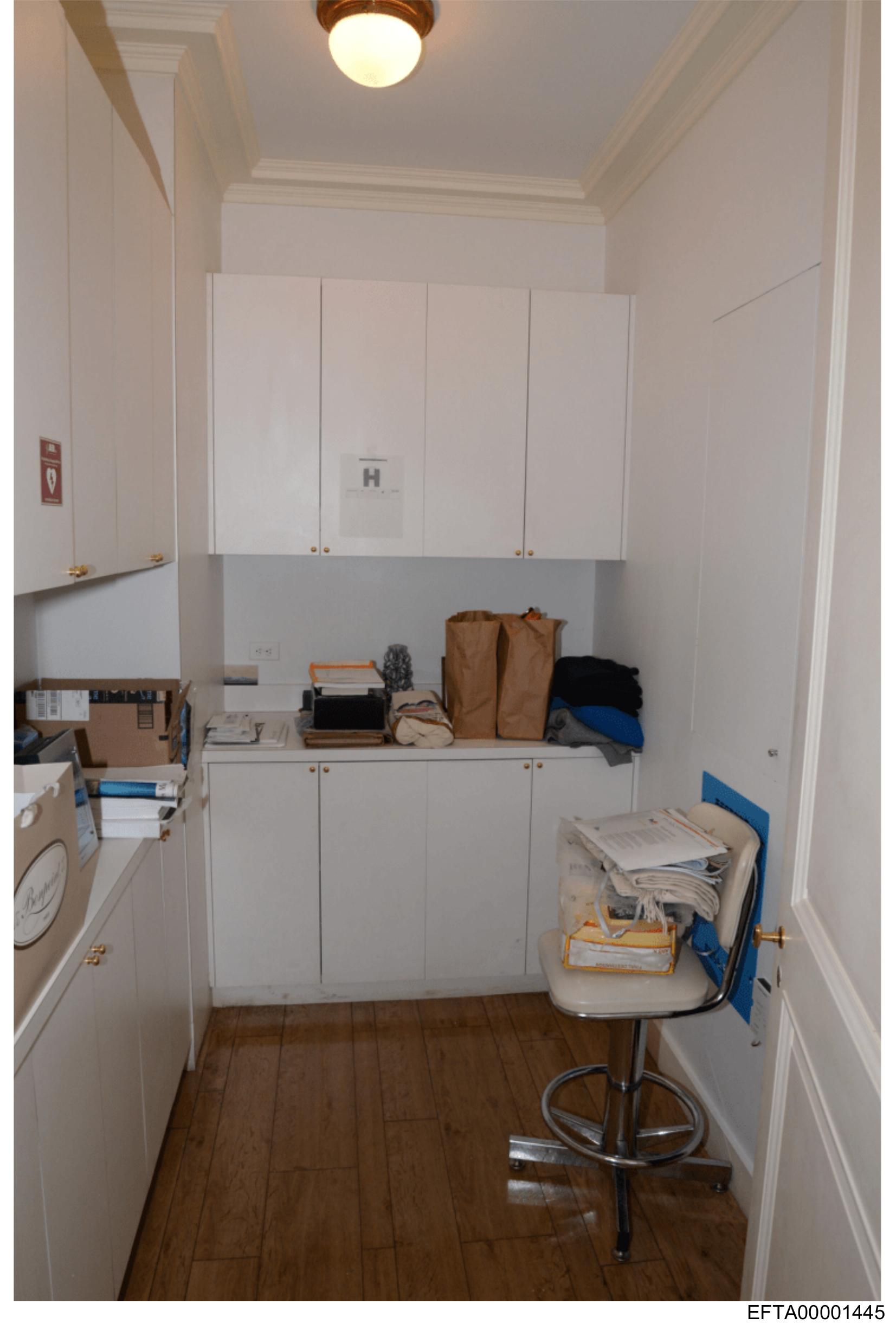 The image shows an interior space that appears to be a small kitchenette or break room area within a commercial setting. There are white cabinets mounted on the walls, with some open doors revealing empty shelves. A blue chair is visible towards the right side of the frame, and it looks like there's a pile of papers on top of what could be a desk or countertop to its left. In the foreground, we can see various items including a cardboard box that seems to contain some kind of product or materials. There's also a roll of paper towels next to a blue device, which might be an office machine or possibly a medical piece of equipment, given the context and the presence of what appears to be a red fire extinguisher on the wall. There is no text visible in the image that provides additional information or context. The style of the photo suggests it was taken casually, perhaps for documentation purposes, as it does not exhibit professional photography techniques.