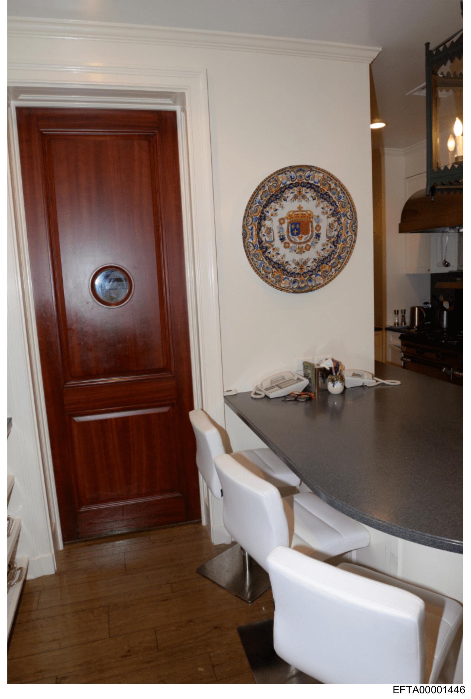 The image shows an interior space that appears to be a kitchen and dining area of a residence. In the foreground, there is a dark wooden door with a decorative panel in its center. Adjacent to the door on the wall is a round piece of artwork or decor with a colorful design. The room is furnished with modern white barstools lining the edge of a light-colored countertop that serves as a kitchen island. There are no visible texts, people, or distinctive locations in this image. The style of the photograph suggests it was taken to showcase the interior design and layout of the space.