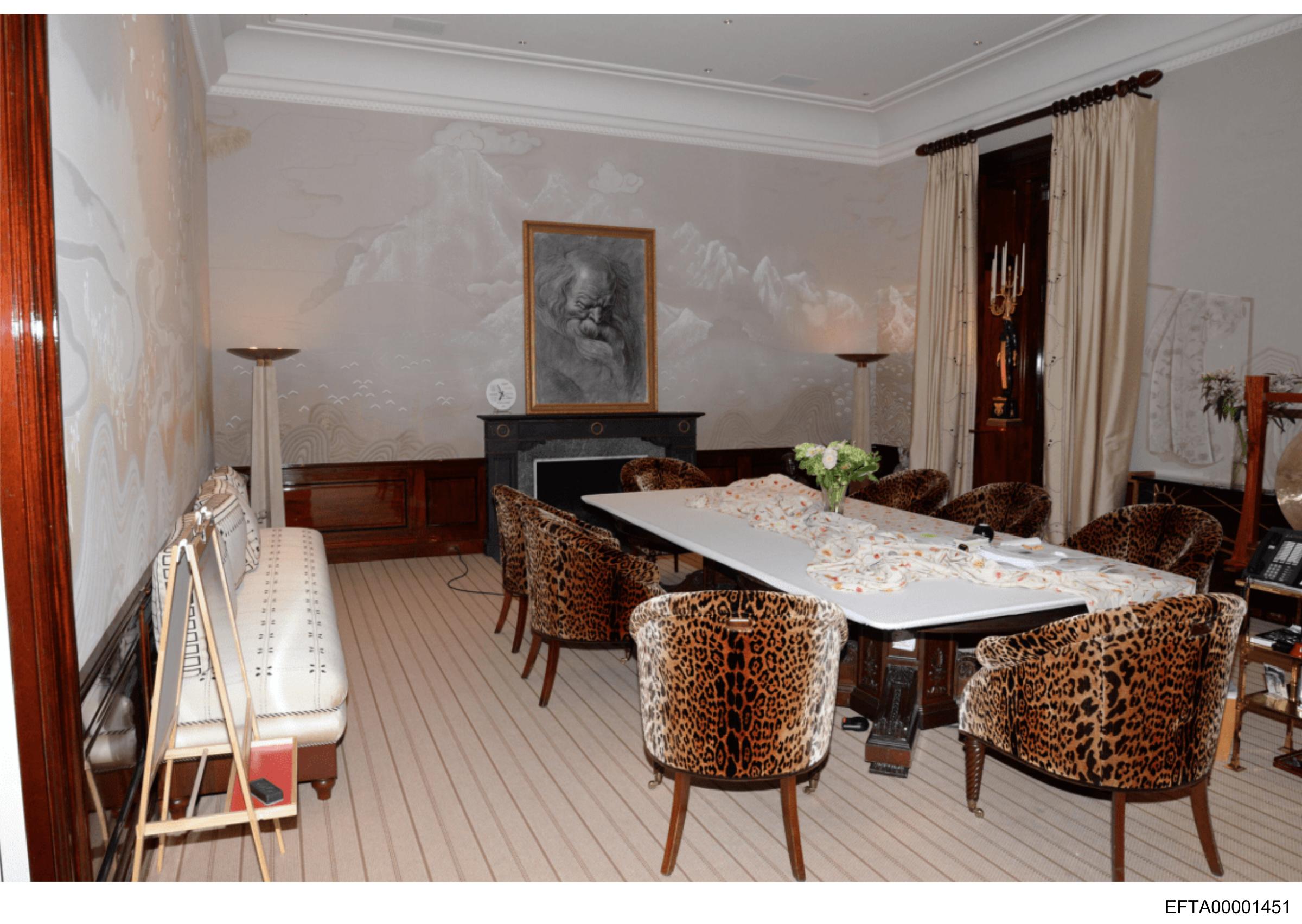 The image showcases a luxurious dining room setting. The focal point is a long, narrow table draped with an elegant white tablecloth and adorned with what appears to be fine china. Surrounding the table are several high-backed chairs upholstered in a vibrant leopard print pattern that adds a bold contrast to the otherwise formal decor. The room itself exudes sophistication, with tall walls covered in an intricate design that might suggest a historical or aristocratic residence. A prominent feature is a large oil painting displayed on one of these decorated walls. The flooring is not clearly visible but seems to be a part of the room's overall opulent aesthetic. The lighting in the room appears soft, suggesting a warm and inviting atmosphere. There are no people or texts visible in the image, and the focus remains solely on the interior design and arrangement of the dining area.