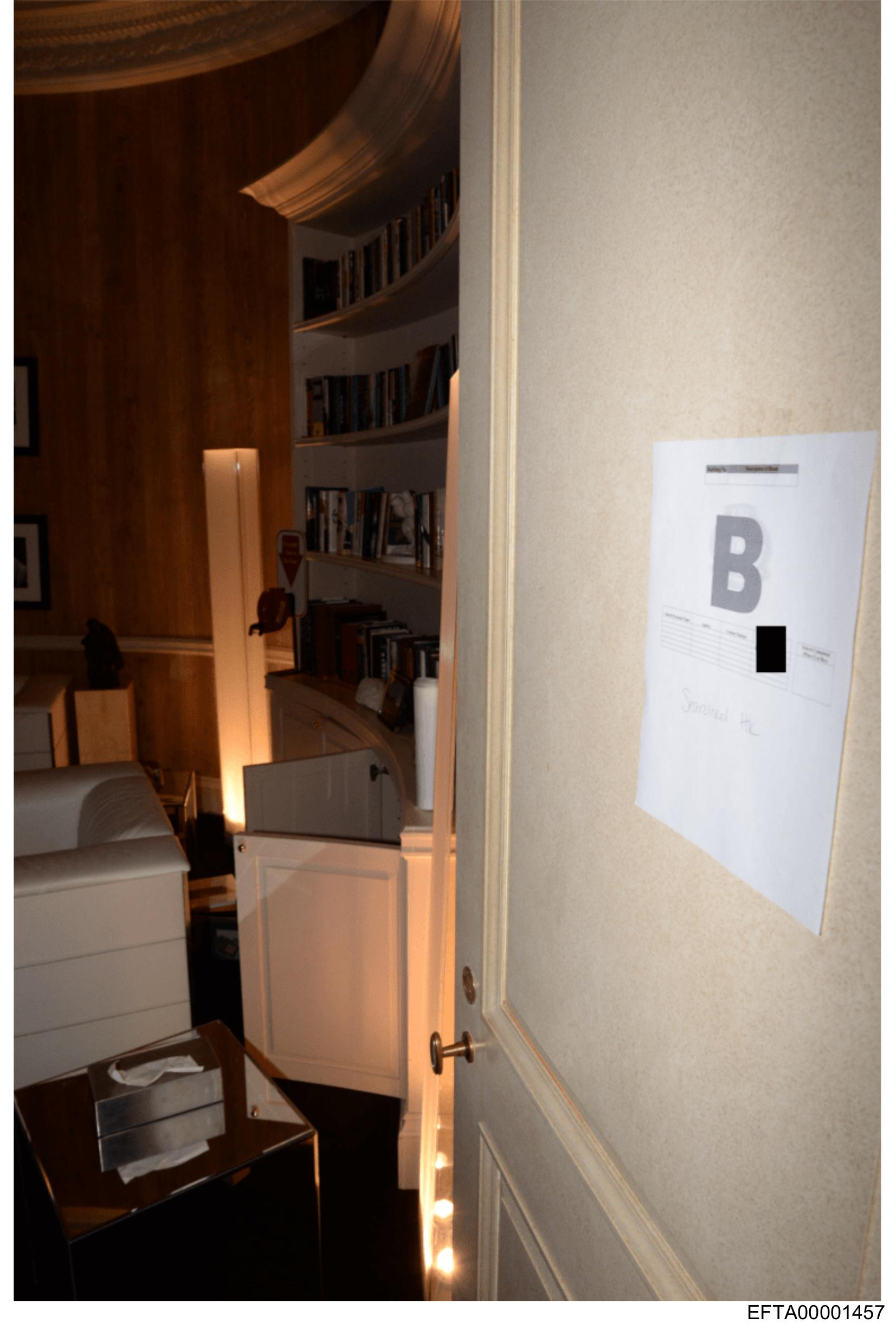 The image shows an interior view of a room through a partially open door, with the room bathed in warm light that appears to be from table lamps or other ambient sources. On the wall inside the room is a piece of paper bearing the letter "B" and some indecipherable marks or scribbles beside it. There are multiple books stacked neatly on what looks like a shelf or desk, suggesting this could be a study or office area. The door has a modern design with a metallic handle, and there's a reflection of light on its surface.