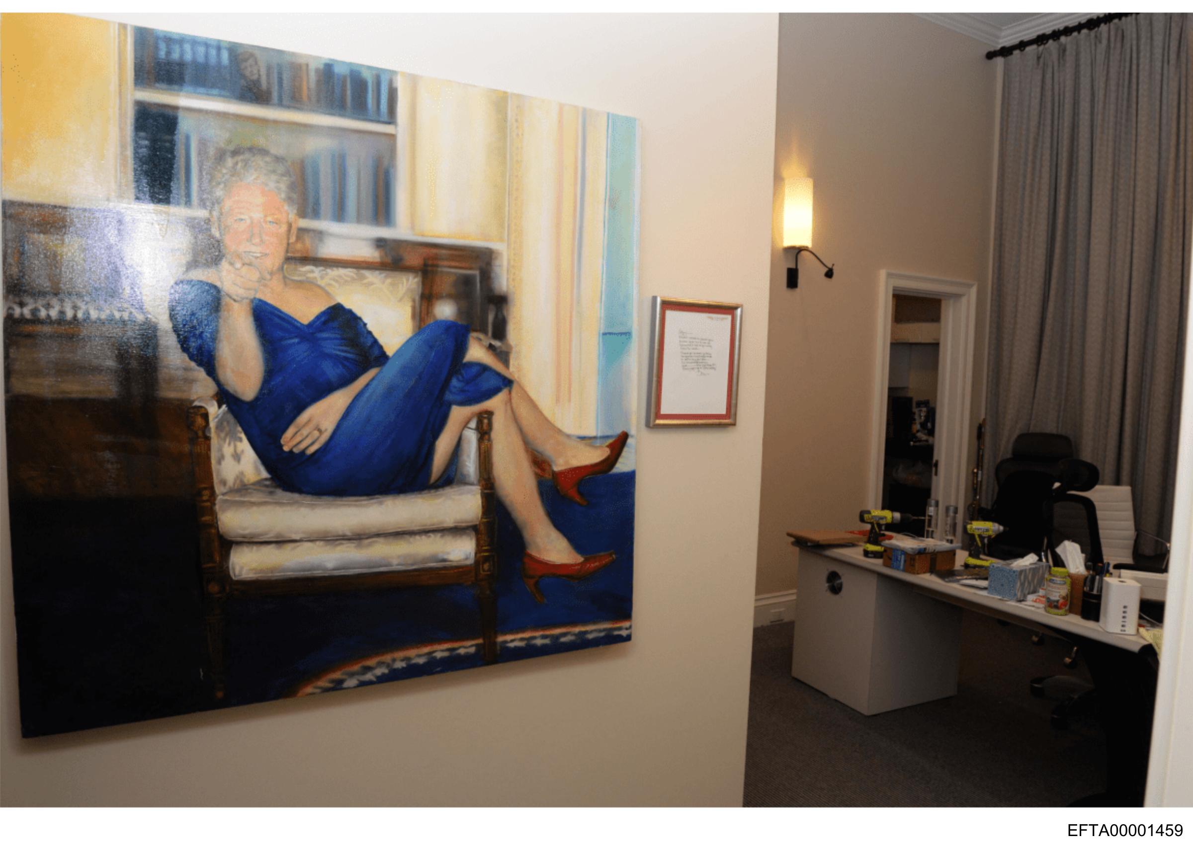 The image presents a cozy room with light walls and a window partially covered by curtains. The most striking feature is a large painting of Queen Elizabeth II that dominates the wall space above a desk. The Queen, depicted in her iconic blue dress with a red sash, is seated on a throne, creating an air of regality. The room also contains several other items adding to its lived-in feel. A computer monitor sits on the desk, and a cup rests nearby, suggesting recent use. Despite these signs of activity, no people are visible in the image. The focus remains solely on the painting and the quiet room it adorns.