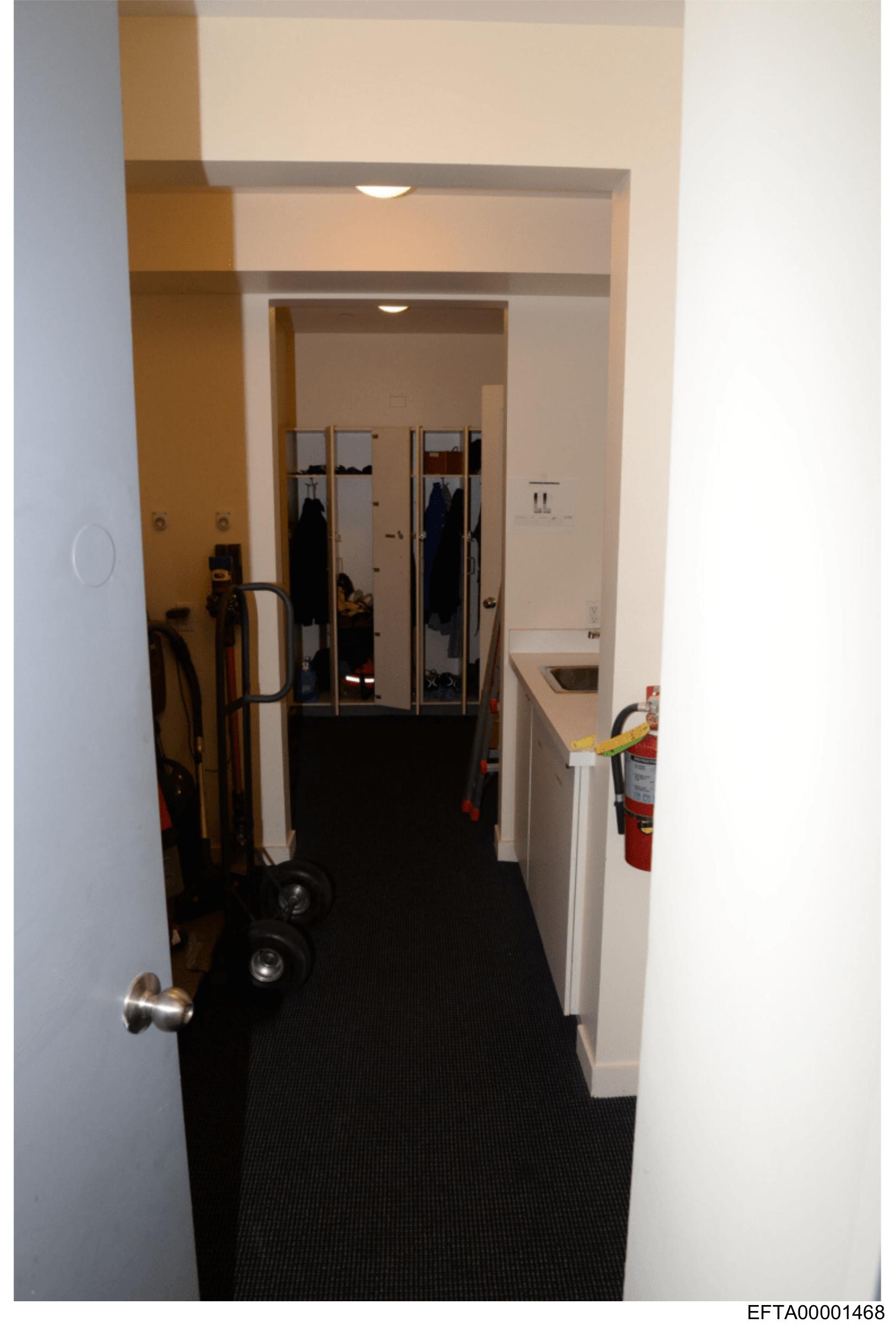 The image shows an interior hallway with a door partially open at the end of the corridor.