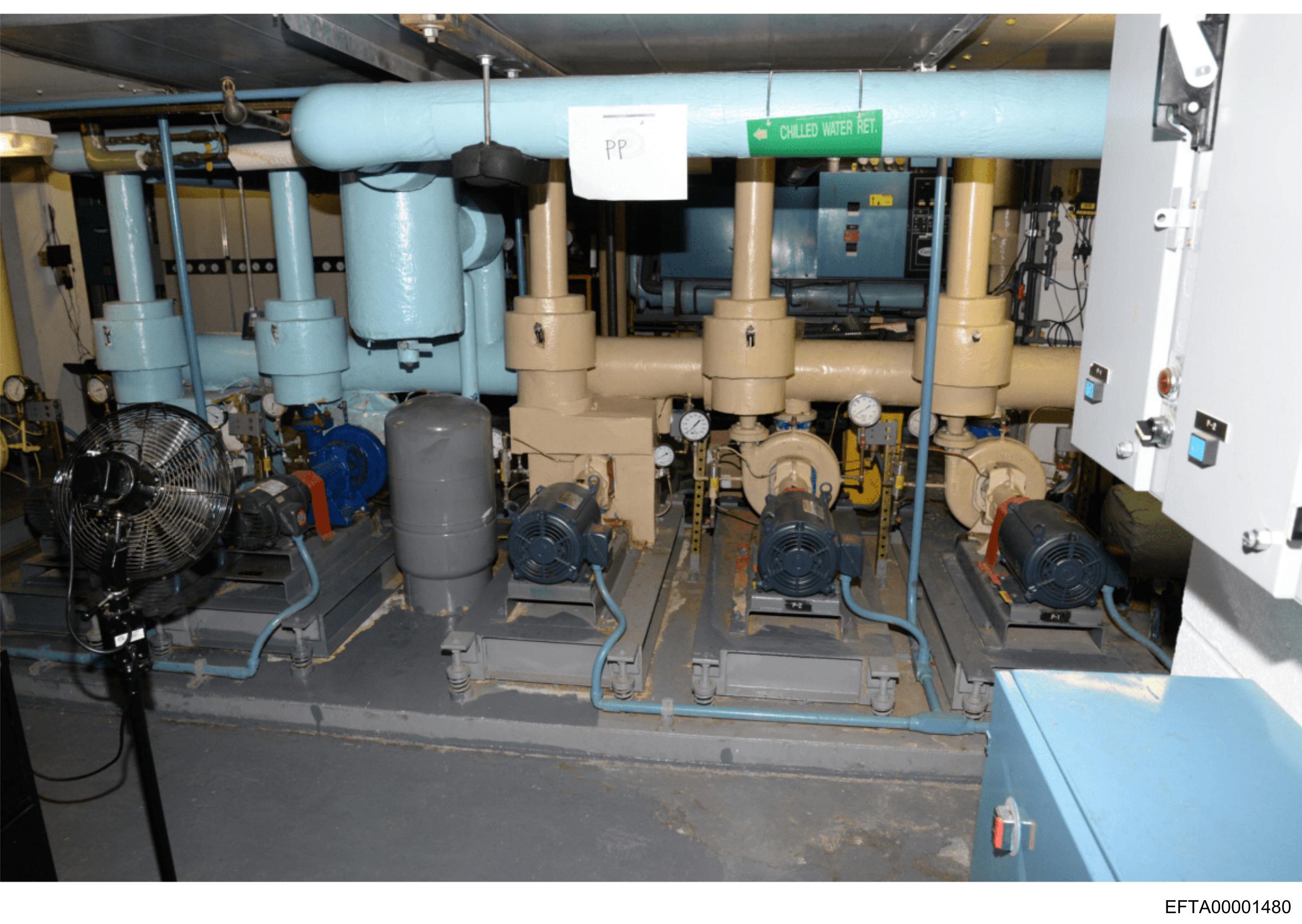 The image displays an industrial setting with mechanical equipment. Dominating the scene is a large machine comprising of several cylindrical structures interconnected by pipes and rods. These elements are predominantly blue and yellow, suggesting they might be part of a larger assembly. There's also visible text on some parts of the machinery; however, due to the resolution and angle, it's not legible enough to provide accurate details about its function or operational instructions. The environment appears well-lit but lacks any human presence, implying a focus on the machine itself rather than activity within the area.