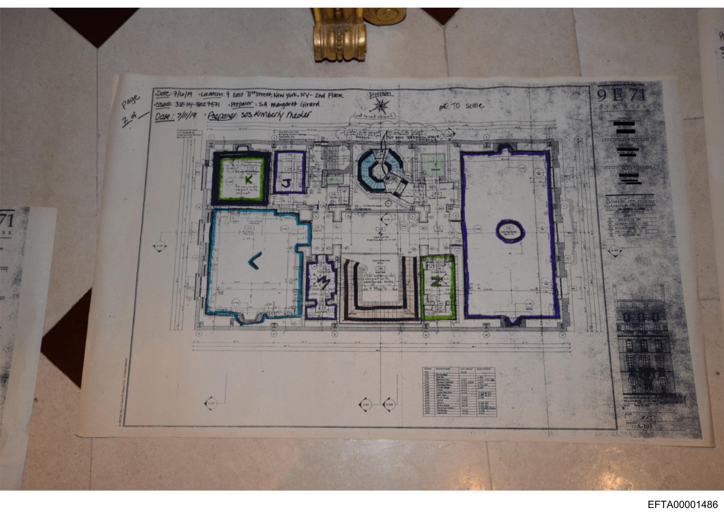 The image shows a blueprint document with various sections labeled. There are different colored annotations on the plan, indicating areas of interest or changes. The text on the blueprint is too small to read clearly, but it appears to be technical jargon related to architectural design. The layout includes rooms, hallways, and possibly mechanical spaces. On the bottom right corner of the image, there's a watermark or logo that reads "ETFX." There are no people visible in this photograph, which focuses on the blueprint itself. The setting suggests an indoor environment, likely an office or construction site where such plans would be utilized.