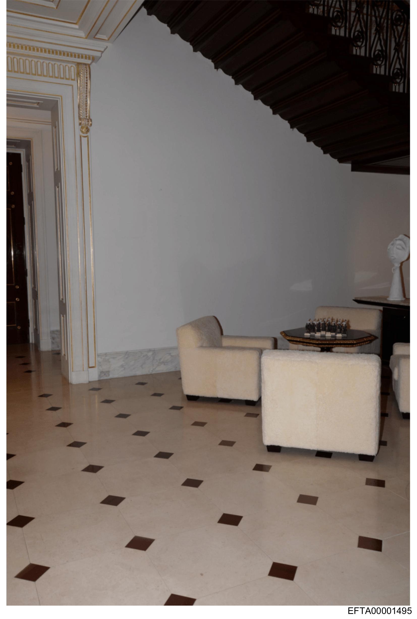 This image captures a grand entrance hall with high ceilings and classical architectural details such as columns and decorative moldings on the walls. The flooring is patterned with large tiles that feature intricate designs in dark tones, providing a striking contrast to the lighter-colored room. On the right side of the hallway, there are comfortable seating arrangements consisting of armchairs upholstered in a light fabric, placed around what appears to be a small round table with a glossy surface. There is no visible text, and the image does not contain any people. The overall ambiance suggests a formal or upscale environment, possibly within a historical building or luxury residence.