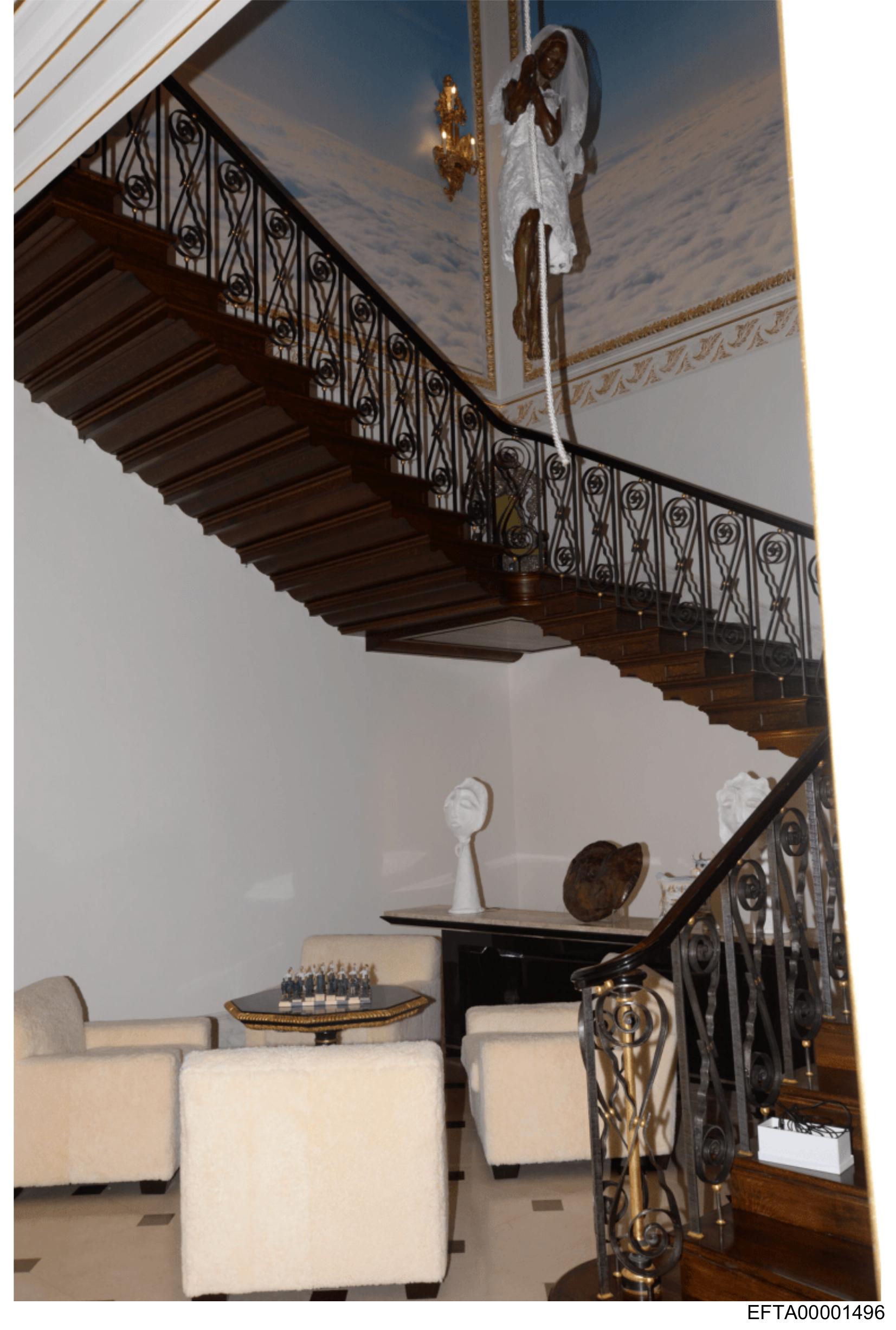 The image shows a cozy room with an inviting atmosphere. On the left side of the frame is a staircase with an elegant wrought iron railing and a wooden tread. At the top of the stairs, there's a figure that appears to be standing against the wall, possibly part of a painting or mural. The walls are adorned with artwork, including a piece depicting a landscape or space scene. Below, there is a well-furnished living area with comfortable seating, including sofas and chairs arranged around what looks like a coffee table. A chandelier can be seen hanging from the ceiling, adding to the room's sophistication. There are no visible texts, people, or locations that stand out in this image. The style of the photograph is casual and seems to capture an everyday scene with warmth and charm.