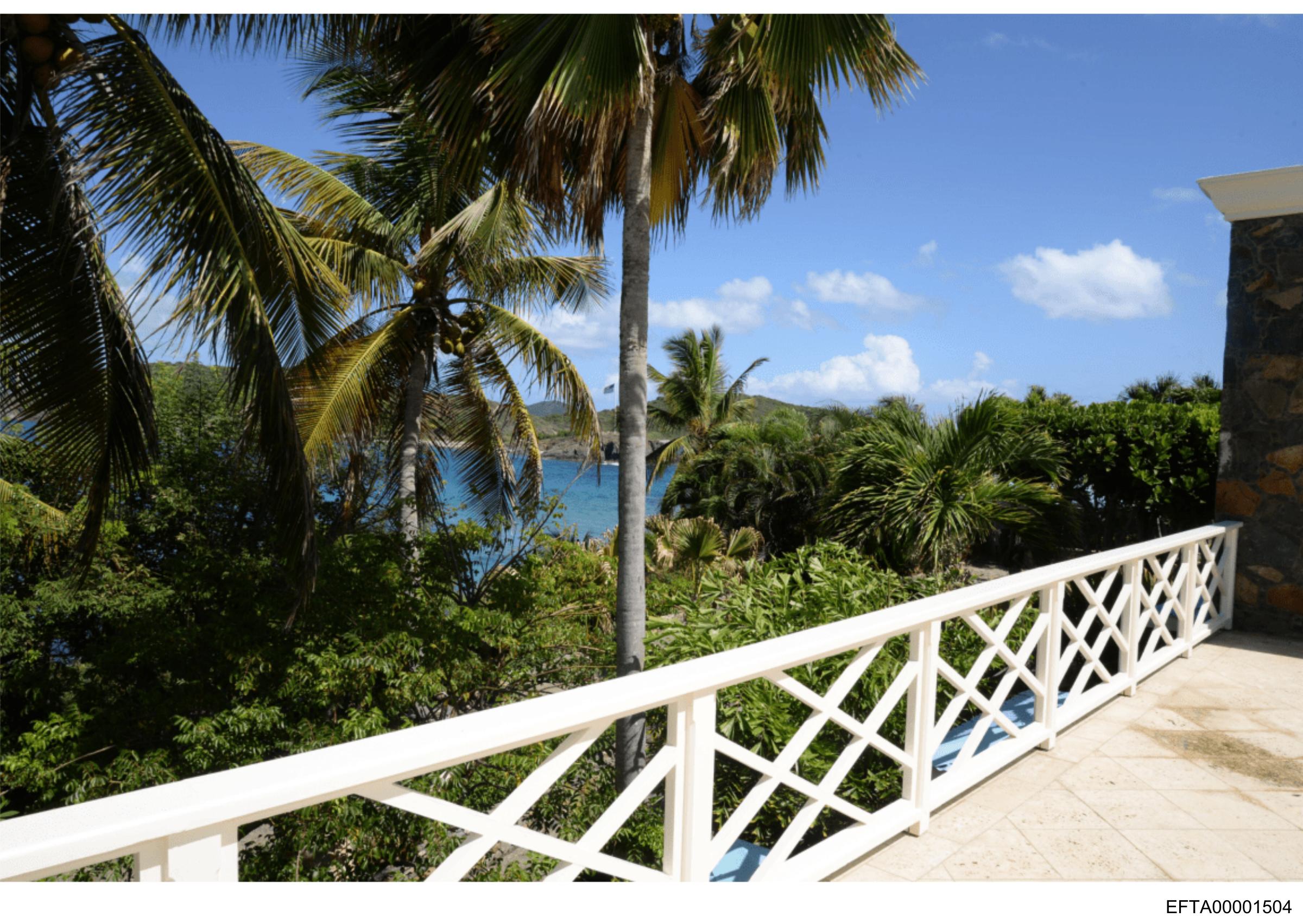 The image depicts a serene tropical location. There is a balcony with a railing made of light-colored wood. From the balcony, you can see lush palm trees and other greenery extending towards a body of water that appears to be an ocean or large sea. The sky is clear with few clouds, suggesting a sunny day. On the left side of the image, there's a watermark that reads "etix" in white text. There are no people visible in the frame.