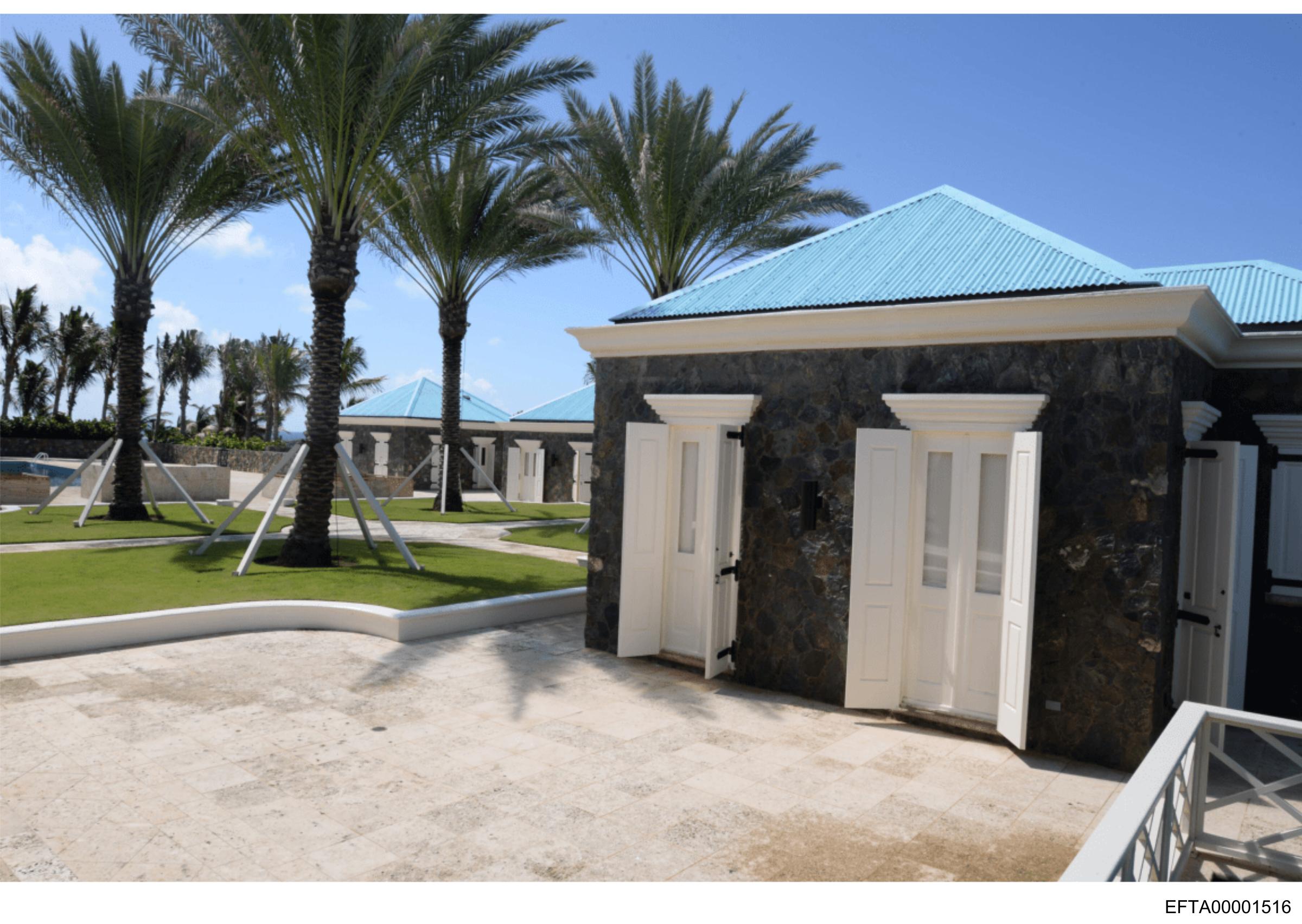 The image shows a building with a distinctive blue roof and white doors, set against the backdrop of palm trees and what appears to be a clear sky.