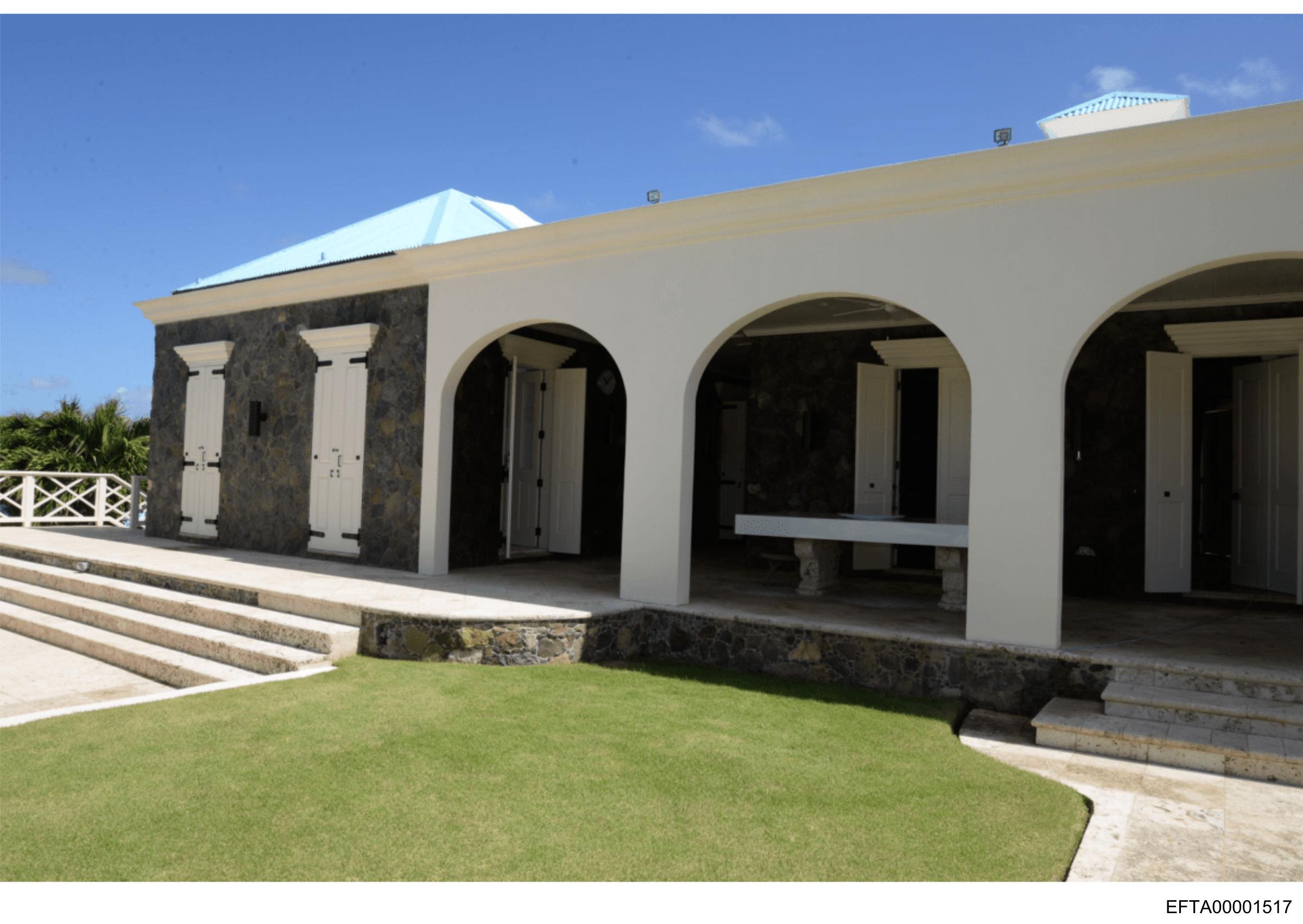 The image shows a building with a classic architectural style, featuring arched doorways and a flat roofline with what appears to be a decorative element at the center of the roof. In front of the building, there's a lawn area with well-manicured grass. The sky is clear, suggesting it might be taken on a sunny day. There are no visible texts or people in this image. The style of the photo suggests it could be from a real estate listing or promotional material for the property.