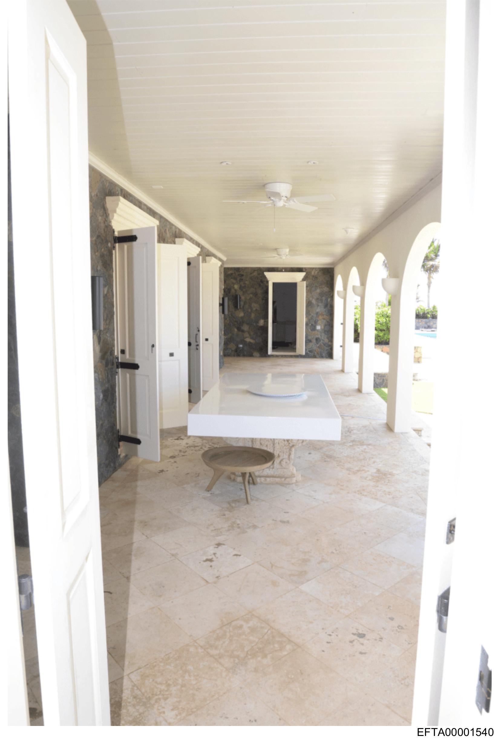 The image shows an interior view of a building with a rustic aesthetic. The room features wooden ceiling beams and walls made of stone tiles or similar materials. There is a central white fireplace surrounded by seating that includes sofas and chairs, suggesting this space is used for relaxation or socializing. Natural light enters the room through open doors on the right side, which are framed in white wood with transom windows above them. The flooring appears to be made of large stone tiles, complementing the walls. On the left, there's a partial view of what could be a staircase leading upwards. There is no visible text or identifiable people within this image.