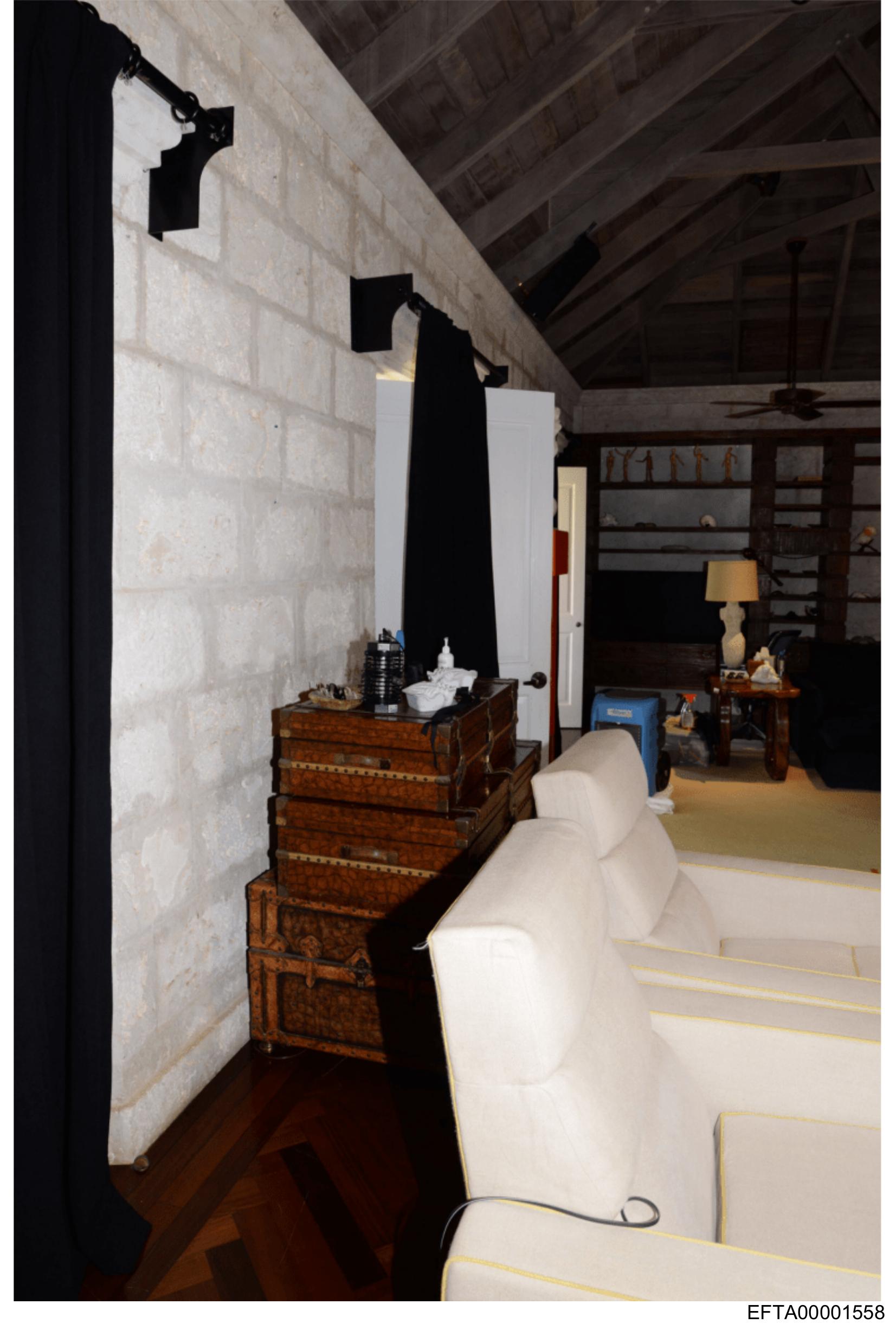 The image depicts an interior space with a rustic and cozy ambiance. To the left, there is a stone wall with dark curtains partially drawn, possibly covering a window or entrance. Above the curtain rod hangs a piece of artwork or mirror. In front of the stone wall stands a wooden trunk with various items on top, including what appears to be a decorative vase or container and a small figurine. To the right, there is a sectional sofa with white cushions, providing seating in the room. Above the sofa, exposed wooden beams form the ceiling structure, adding to the rustic aesthetic of the space. The floor is not fully visible but seems to have dark wood planks that complement the beam and stone elements. In the background, partially obscured by a sofa cushion, there might be another piece of furniture or artwork on the wall, but it's not clear from this angle. There are no texts, people, or significant objects other than those described in the image. The style of the photograph is candid, capturing an everyday scene without professional staging.