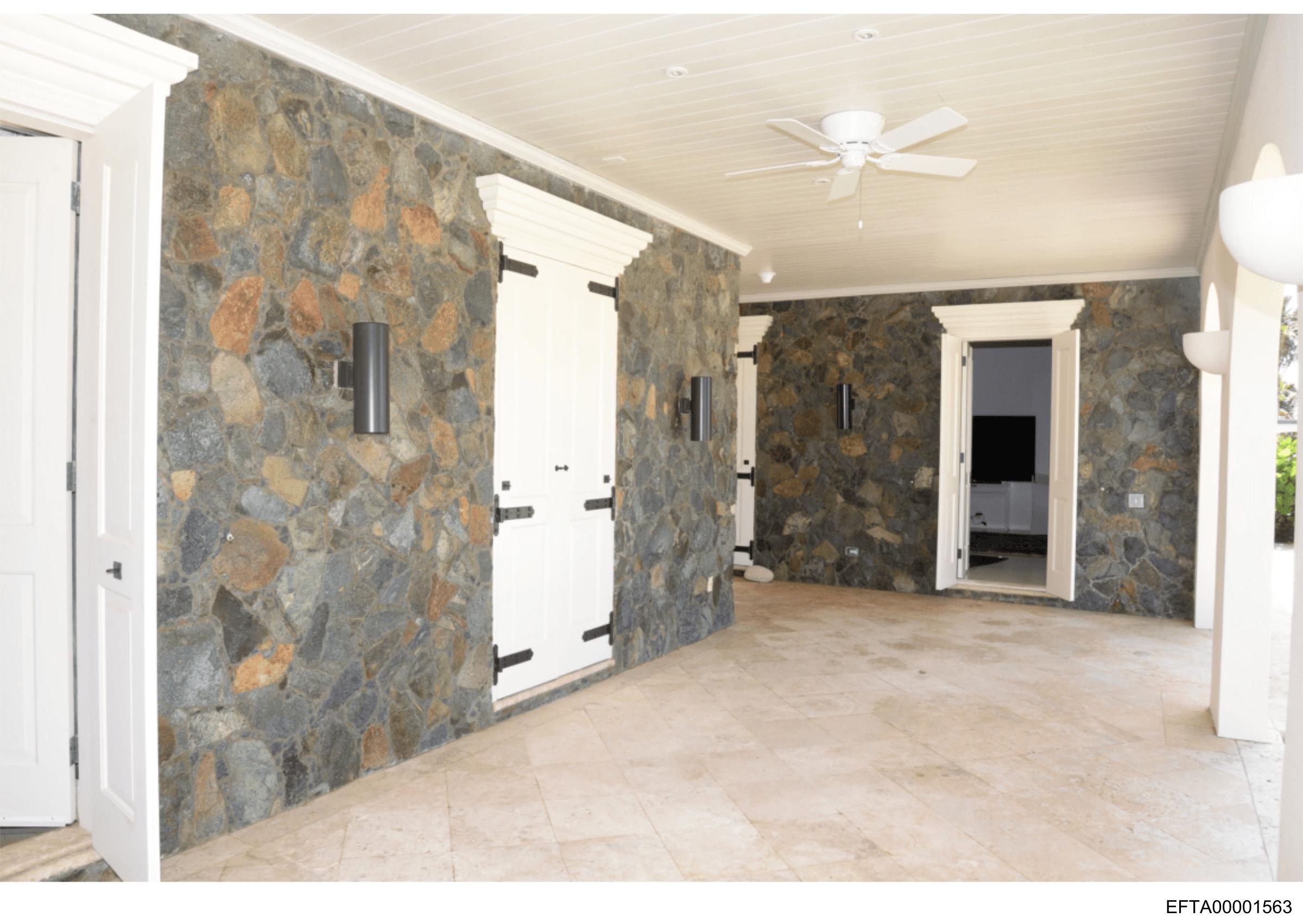 The image shows an exterior view of a building with an upper deck area. The wall features a natural stone facade, and there is a large window with white frames that appears to be the entrance to the upper level. A white railing lines the edge of the deck, providing safety for those standing on it. There's a watermark or logo in the lower right corner which includes text, but due to the resolution and angle, it is not clear enough to discern specific details or information from it. The overall style of the image is casual, possibly taken during daylight hours as there are no artificial lights visible.