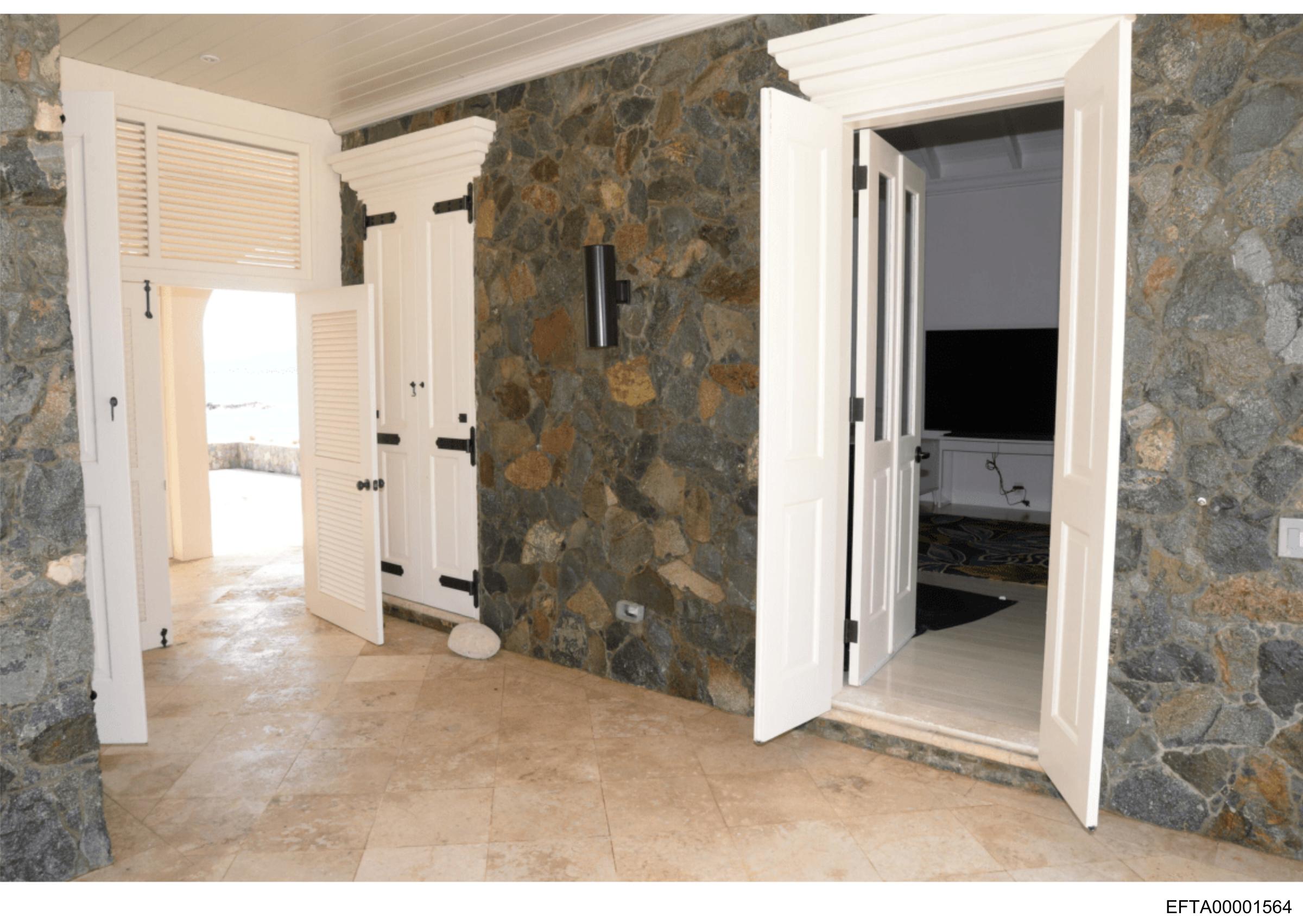 The image shows an interior hallway with a stone wall on the right side and wooden doors leading into rooms. Natural light is streaming in from an opening at the end of the hall, revealing a glimpse of the ocean. There's a text watermark "ETX 5" visible across the image.