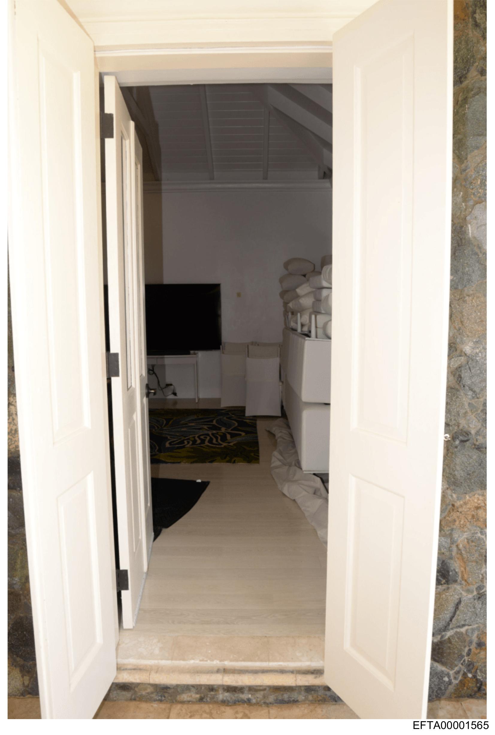 The image shows an interior scene viewed through a partially open door. Inside the room, there's a white wall with what appears to be a light fixture on it and a dark-colored item in the corner, possibly a piece of furniture. The floor is tiled, and there is a rug or runner laid out in front of the door. The walls have exposed rock elements that suggest a natural stone construction. There are no visible texts, people, or other identifiable locations within this view.
