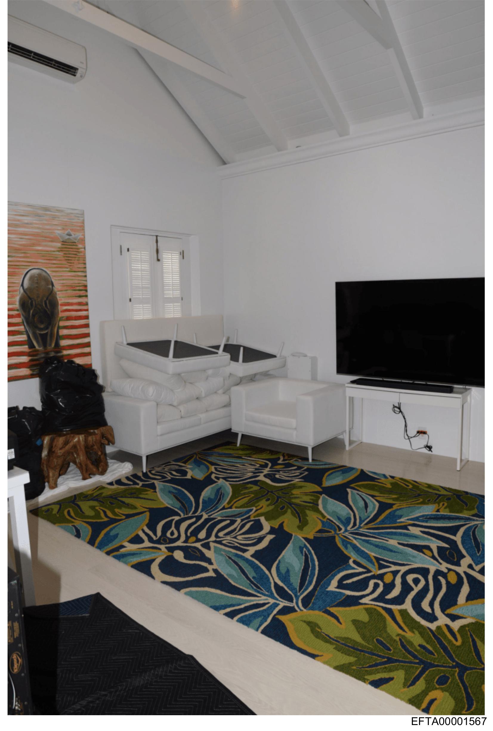 This image depicts a well-lit living room interior during the daytime. The room features an open floor plan with high ceilings and exposed beams painted white. A large window allows natural light to fill the space. There's modern furniture including a sofa, a television mounted on the wall above a console table, and decorative items such as artwork and a patterned rug that adds color to the predominantly neutral tones of the room.