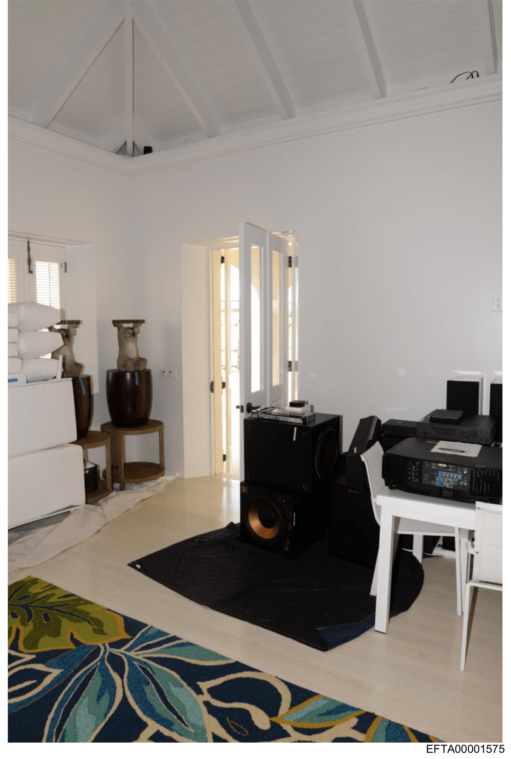 The image captures a cozy living room scene. Dominating the center of the room is a black television set, its screen currently dark, reflecting the ambient light from above. To the left of the TV, two large vases stand tall on the floor, their shapes adding an artistic touch to the space. A door with a glass panel can be seen in the background, allowing a glimpse into the hallway beyond. The room is carpeted in a blue and white pattern, providing a soft contrast to the other elements in the scene.