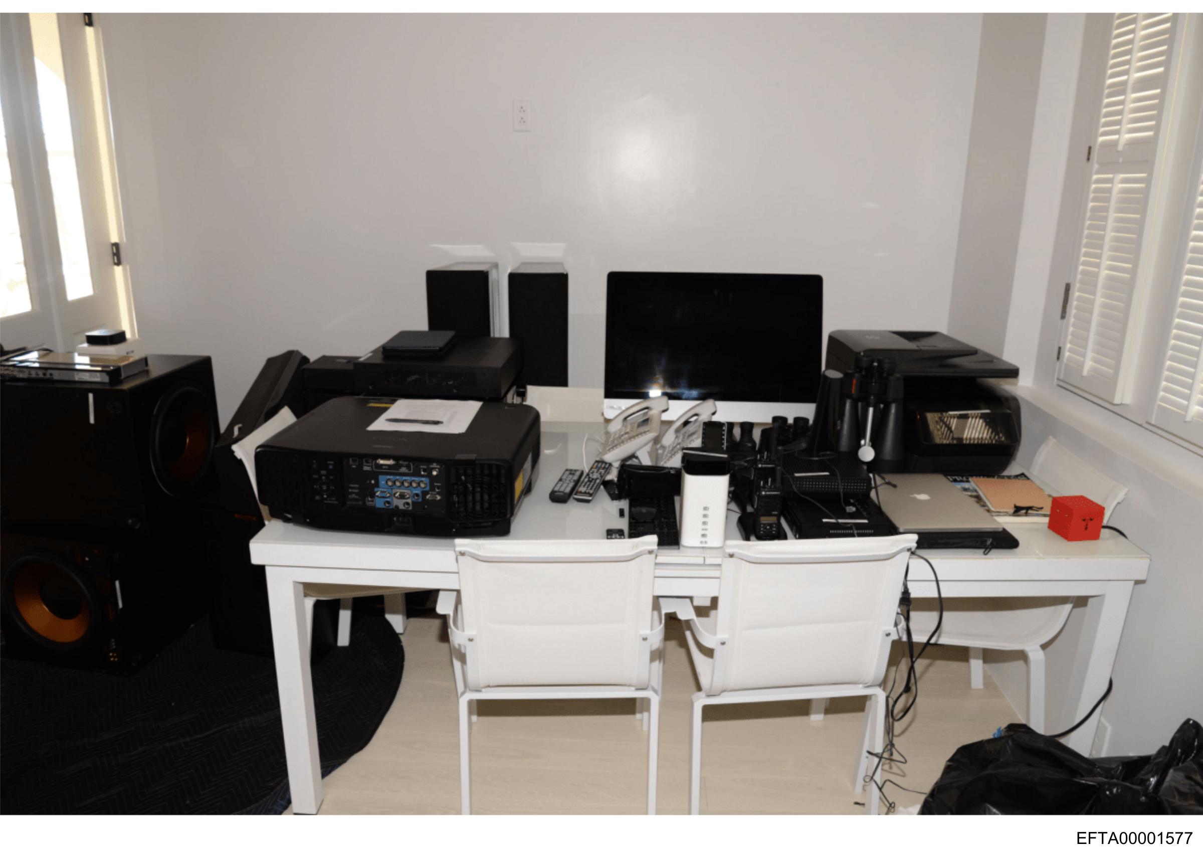 The image depicts a cluttered workspace with various electronic devices and equipment on top of tables.