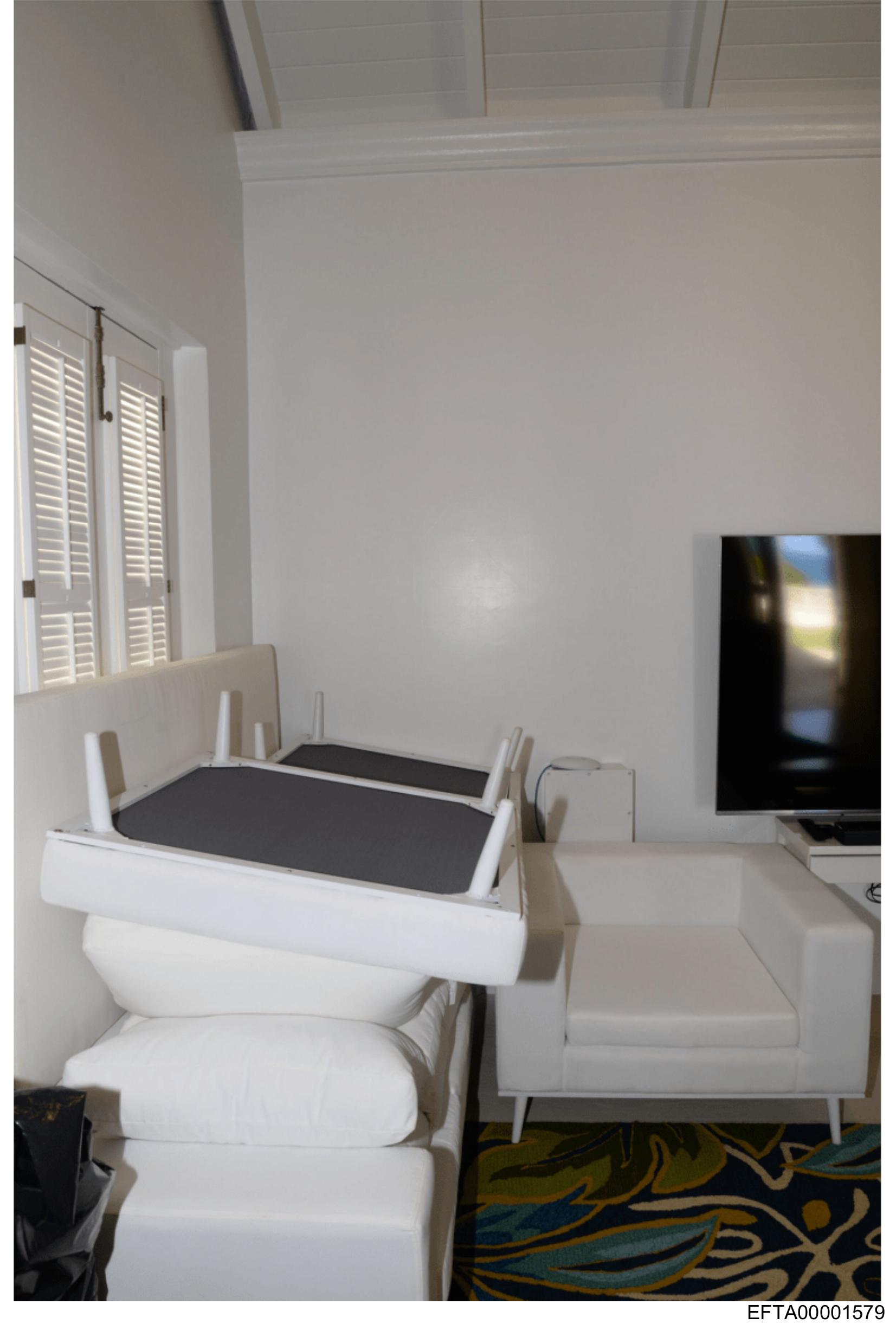 The image displays a room with two mattresses on the floor, one larger and one smaller, both placed against a wall under an air conditioning unit. A television is mounted on the same wall above the smaller mattress. In front of the wall, there's a white sofa facing away from the camera, towards the larger mattress. To the left, partially visible, appears to be a piece of furniture or equipment with vertical bars and a door, possibly part of an exercise machine or a room divider. The floor is covered with carpet featuring a pattern that includes shades of blue, yellow, and green. There are no visible texts, people, or other locations that can be confidently identified from the image.