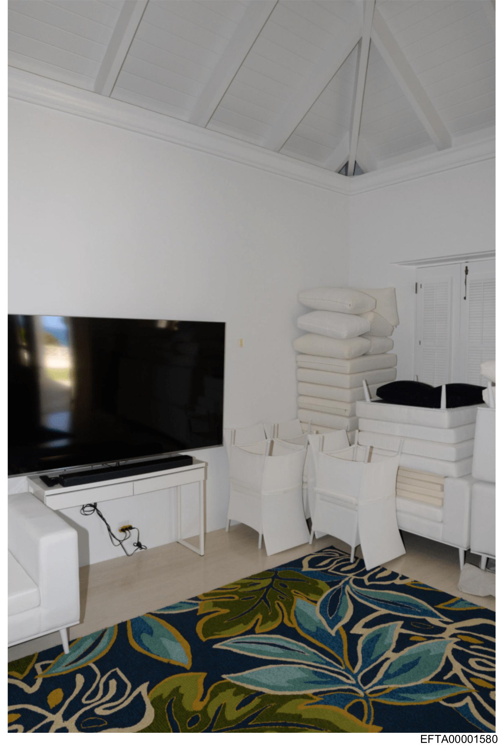 The image shows an interior space that appears to be a living room. In the foreground, there is a large floral patterned area rug with vibrant colors. Behind the rug, a row of three white armchairs is visible, arranged in a symmetrical manner facing each other. Above them, on a beam, is stacked what looks like rolled up carpets or blankets. On the left side of the image, there's a dark flat-screen television mounted on the wall above a low console or table with some objects on it that are not clearly identifiable. The room has a neutral color palette, with the walls and ceiling painted in light shades, which creates a spacious feel. There is no visible text or people within this image.