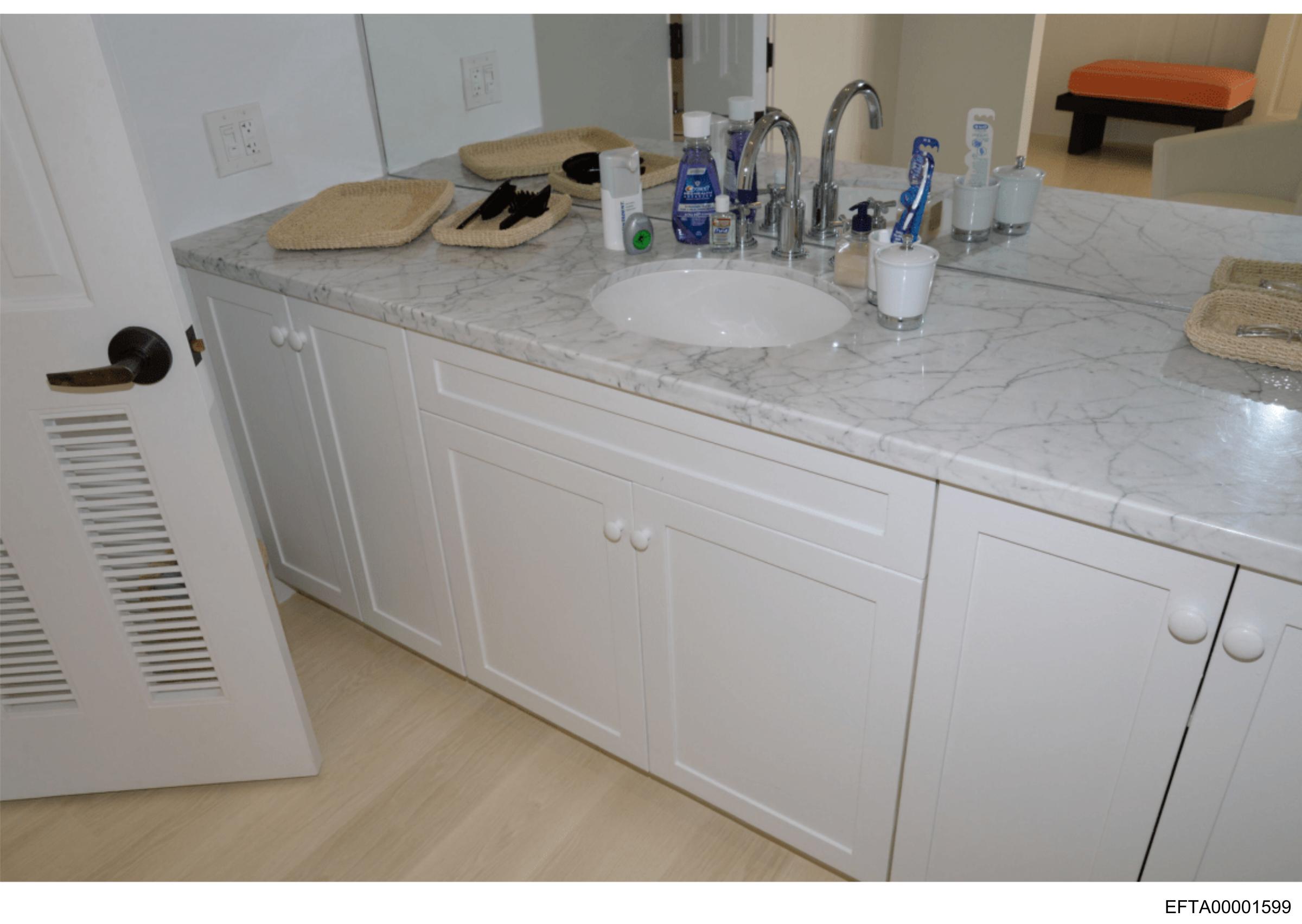 The image shows a bathroom vanity with a marble countertop. On the counter, there is a white sink and various personal care items such as toothbrushes, bottles that likely contain soap or lotion, and what appears to be a small cup or container. The cabinet doors below the countertop have handles on the doors' lower corners, suggesting they are not fully visible from this angle. A door with a handle is partially visible in the background, indicating an exit or entrance to the bathroom.