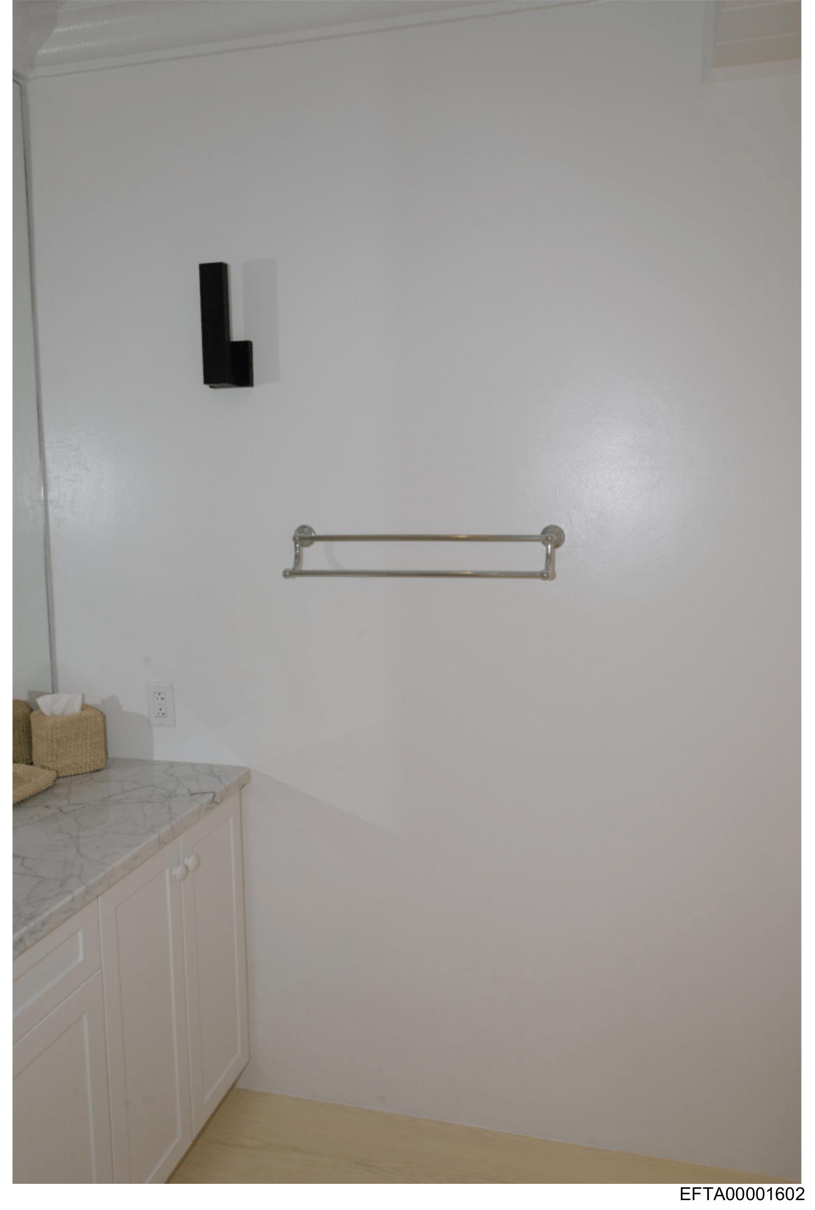 The image shows a portion of a kitchen interior with a focus on a white wall and a metal towel rack attached to it.