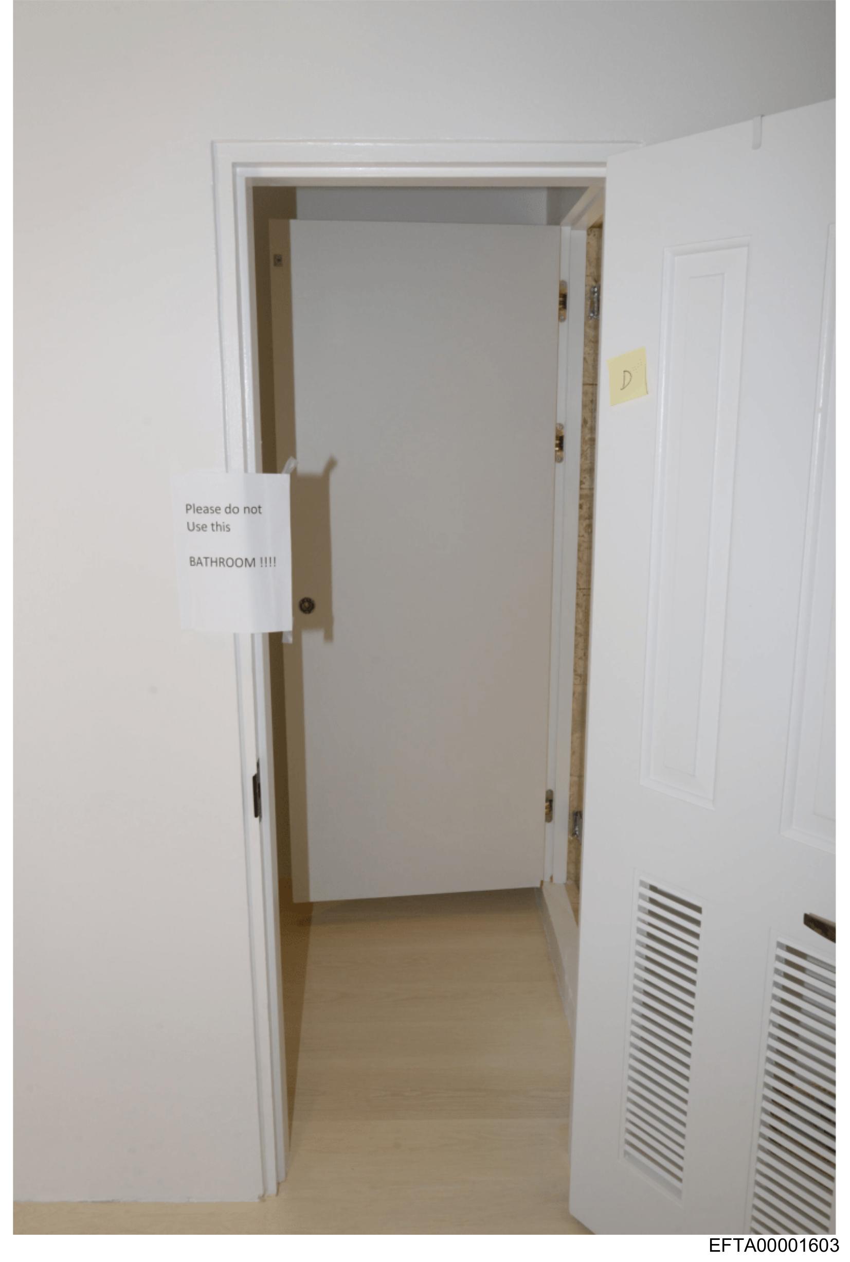 The image shows an interior hallway with a closed door on the left side and a vent at the end of the corridor. There's a sign above the door which is partially obscured but appears to say "RESTRICTED ACCESS" in capital letters, indicating that certain people may not enter this area without permission or clearance. The wall is plain white, and there's no text visible on the floor. The image quality looks low-resolution with pixelation, making it difficult to discern finer details.