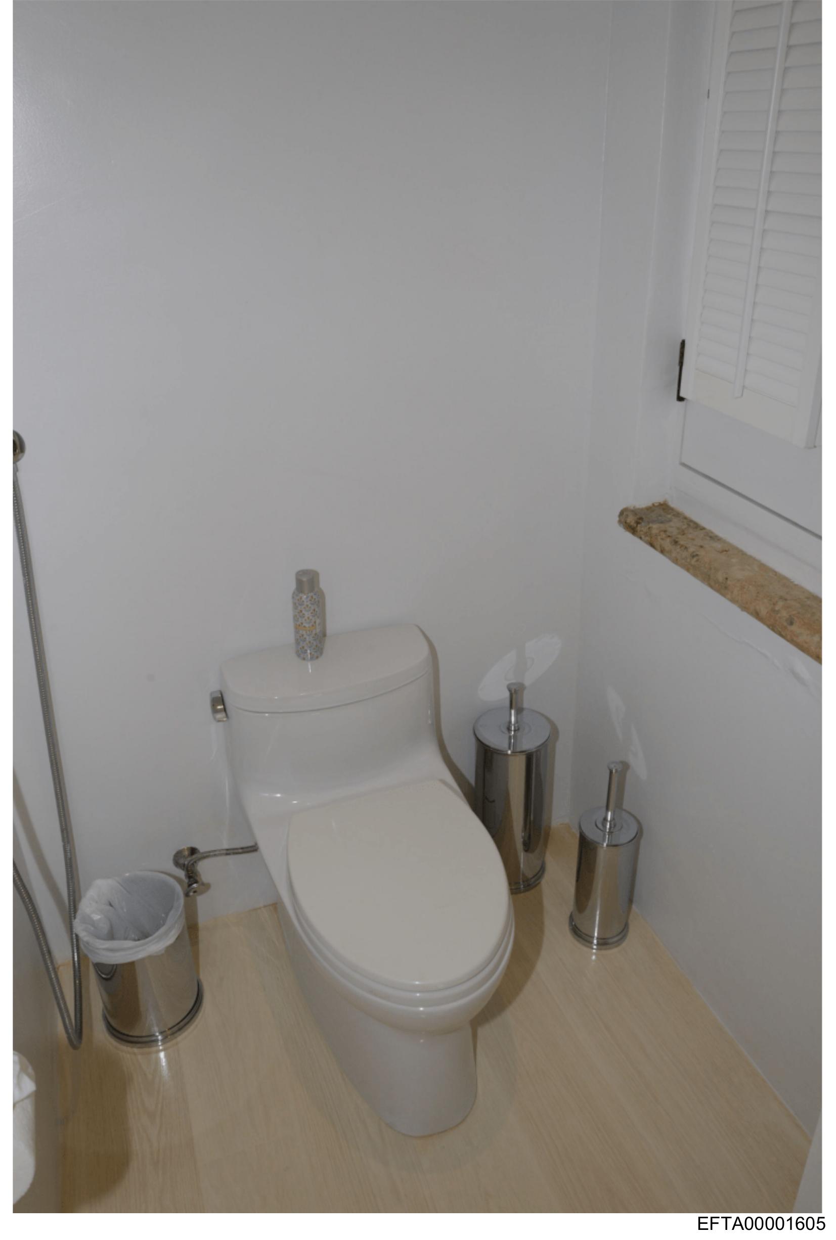 The image depicts a small bathroom with light walls and flooring. The primary object is a white toilet positioned against the wall under a closed window. To the right of the toilet, there's a waste bin, and on top of the tank, there are two decorative objects that appear to be knick-knacks or sculptures. There is no visible text or people in this image. The overall setting suggests a simple and compact bathroom space.