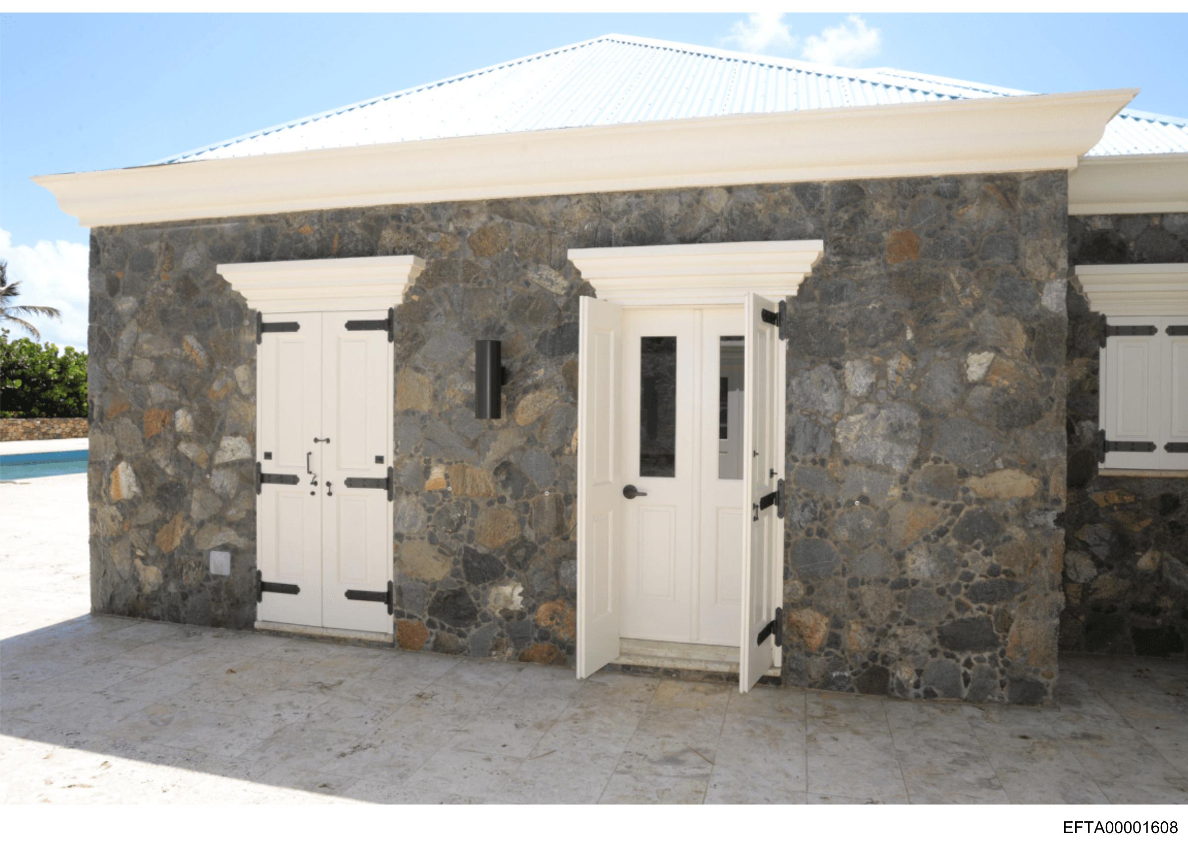 The image shows a rustic structure with stone walls and white door frames.