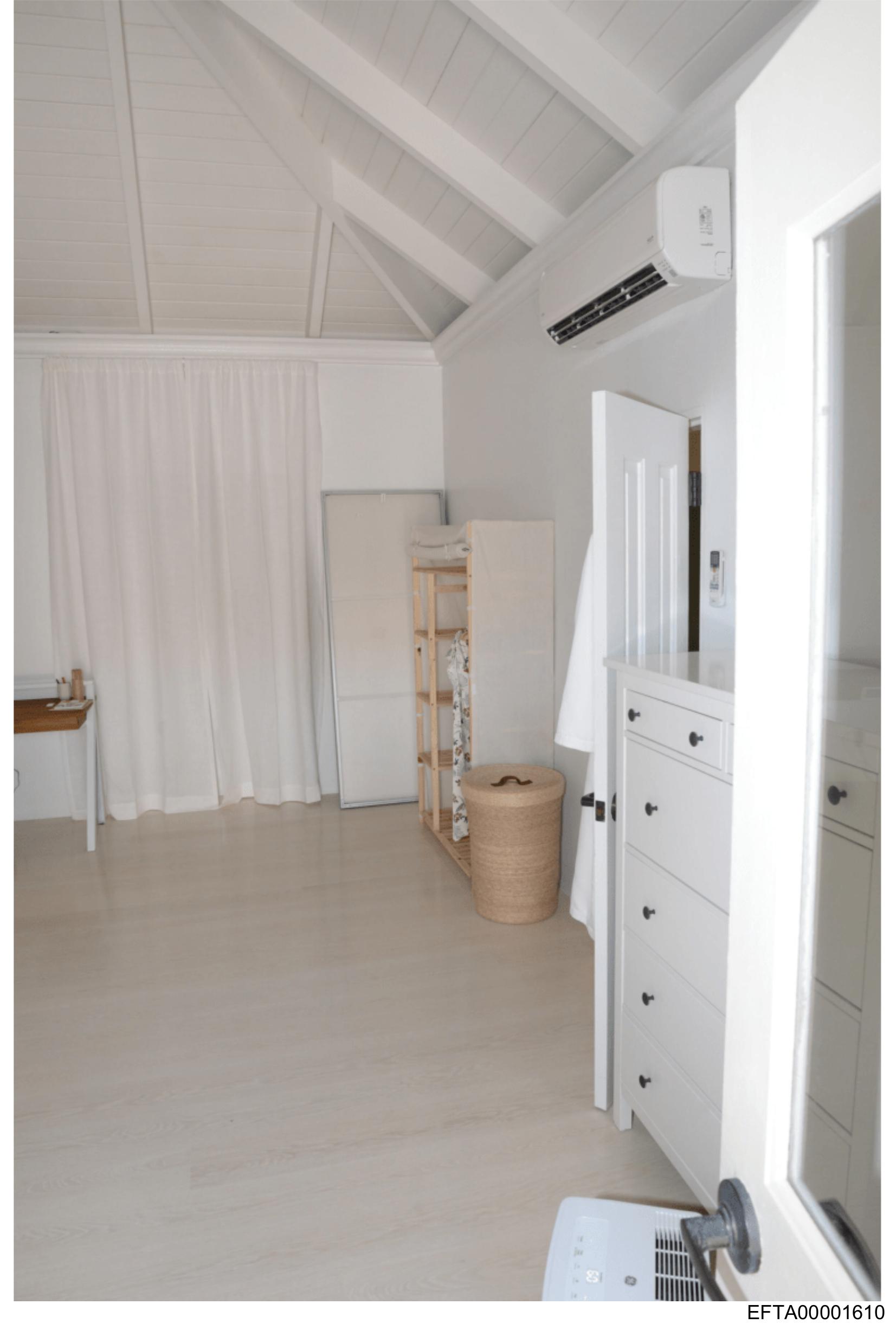 The image displays an interior space that appears to be a room with high ceilings and wooden beams on the ceiling, suggesting a loft or attic setting. There is a white dresser in the background with drawers and what seems to be a mirror mounted above it. On the right side of the frame, there is a piece of furniture that might be a bed frame without bedding. The floor has large tiles and there are no people visible in the image. The lighting in the room is soft, possibly from natural light coming through windows not seen within the frame. There's no text present to provide additional context about the location or purpose of the space.