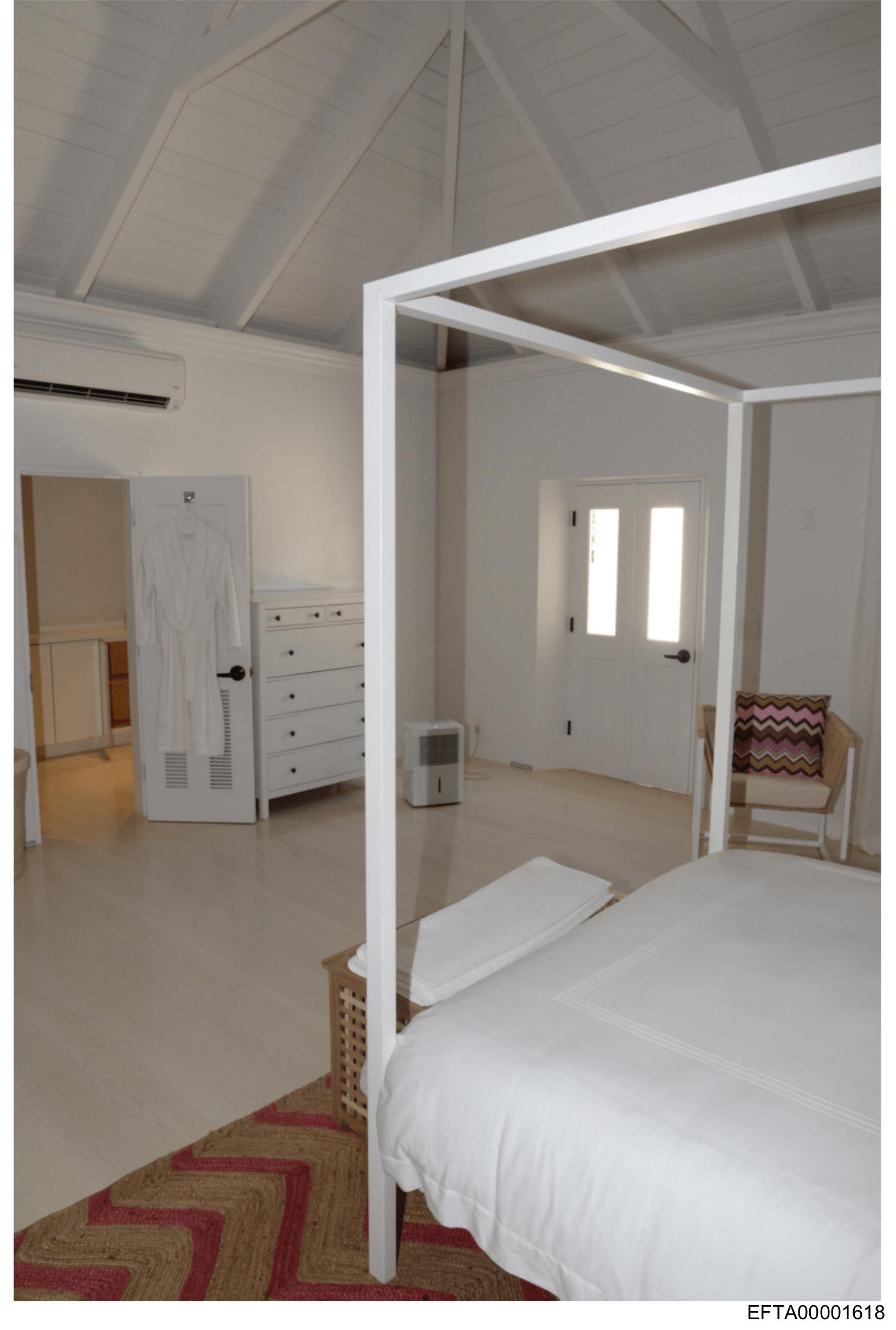 This is a photograph of an interior space that appears to be a bedroom. There's a prominent canopy bed with a white frame and bedding, suggesting a minimalist or modern design style. To the left, there's a piece of furniture that looks like a dresser or wardrobe; it also has a white finish that matches the room's decor. Above the dresser, mounted on the wall, is an air conditioning unit. The floor is covered with wooden planks, and there are no people visible in the image. There's also a rug with a geometric pattern in front of the bed, adding a touch of color to the otherwise neutral tones of the room.