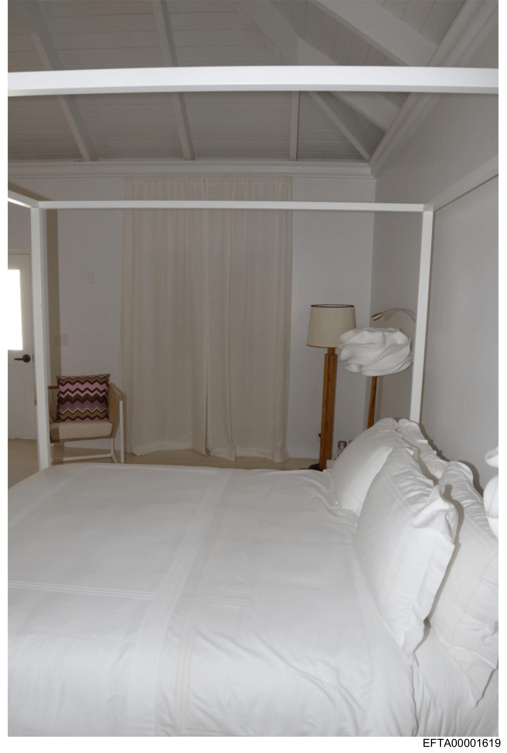 The image shows an interior view of a room with a large bed. The bed is dressed in white linens and pillows, creating a clean, minimalist look. Above the bed, there's a canopy frame that adds a touch of elegance to the design. To the right side, there is a nightstand with a lamp on it, providing lighting for the room. In the background, you can see a part of a white wall and what appears to be a floor-to-ceiling window or sliding door, though its exact function isn't clear from this angle. There is no text visible in the image, and there are no people present. The style of the photograph seems candid, possibly taken to show the room setup.